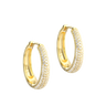 Darling Emma Large Creol fra Aqua Dulce er en tidløs klassiker med et moderne twist. De 20 mm store hoops er fremstillet i 925 sterling sølv og forgyldt med en varm glød, der fanger lyset på smukkeste vis. Overfladen er beklædt med fine, klare zirkonia, der pavé-slebet skaber et strålende, juvelagtigt spil, mens den sikre click-lås sikrer en ubesværet og behagelig pasform hele dagen. Med deres elegante silhuet og 100 % nikkelfri legering er disse creoler det perfekte valg til både hverdagsbrug og festlige lejligheder – et lille glimt af luksus, du altid kan bære med dig.