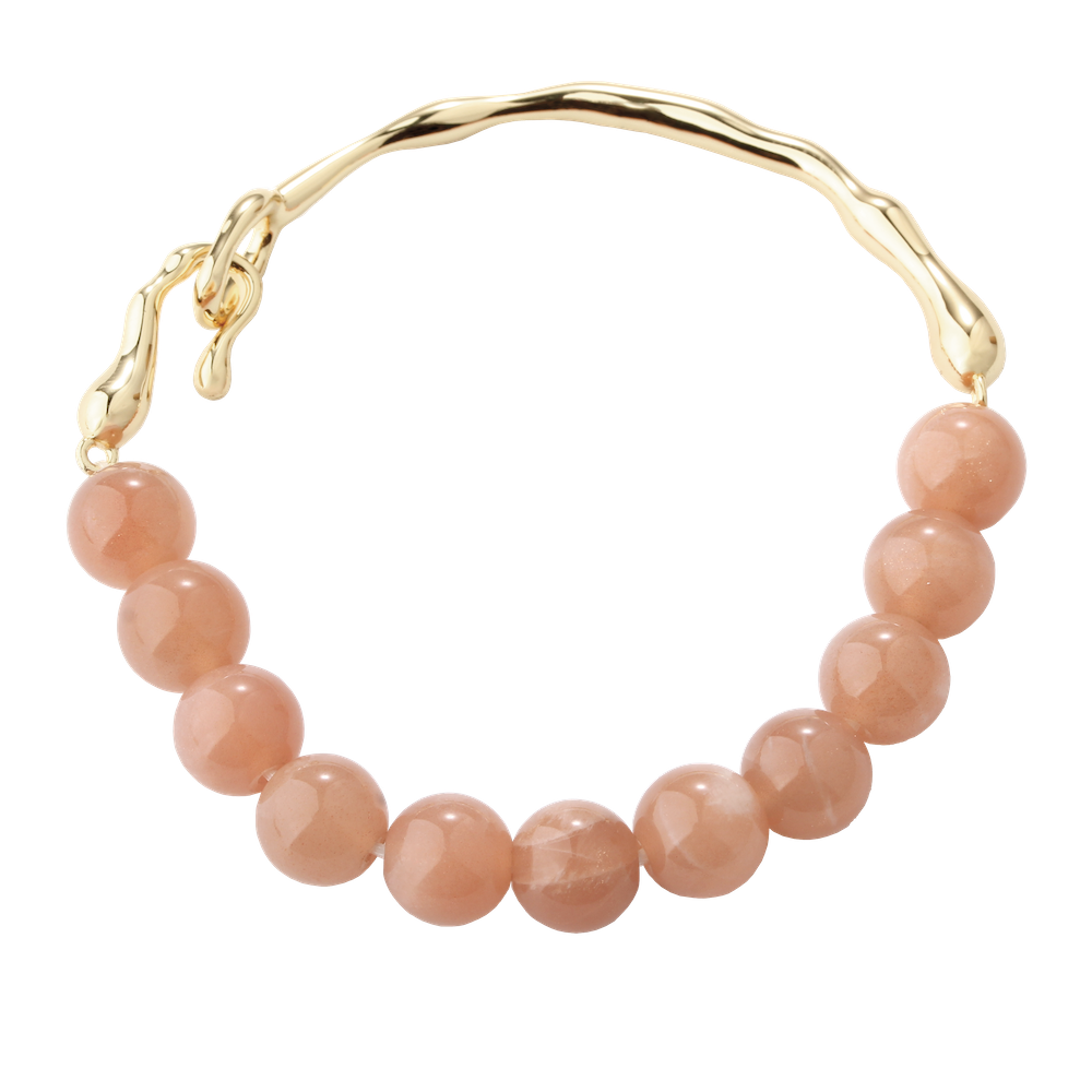 Den 14 karat guld plating fremhæver Solstenens naturlige, gyldne skær og dens let glitrende effekt, hvilket tilfører armbåndet en sofistikeret elegance. - Semi Bangle Design: Armbåndet har et Semi Bangle design. Dette sikrer en delvist fast og flatterende form, der falder smukt om håndleddet, men bevarer den nødvendige fleksibilitet.