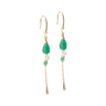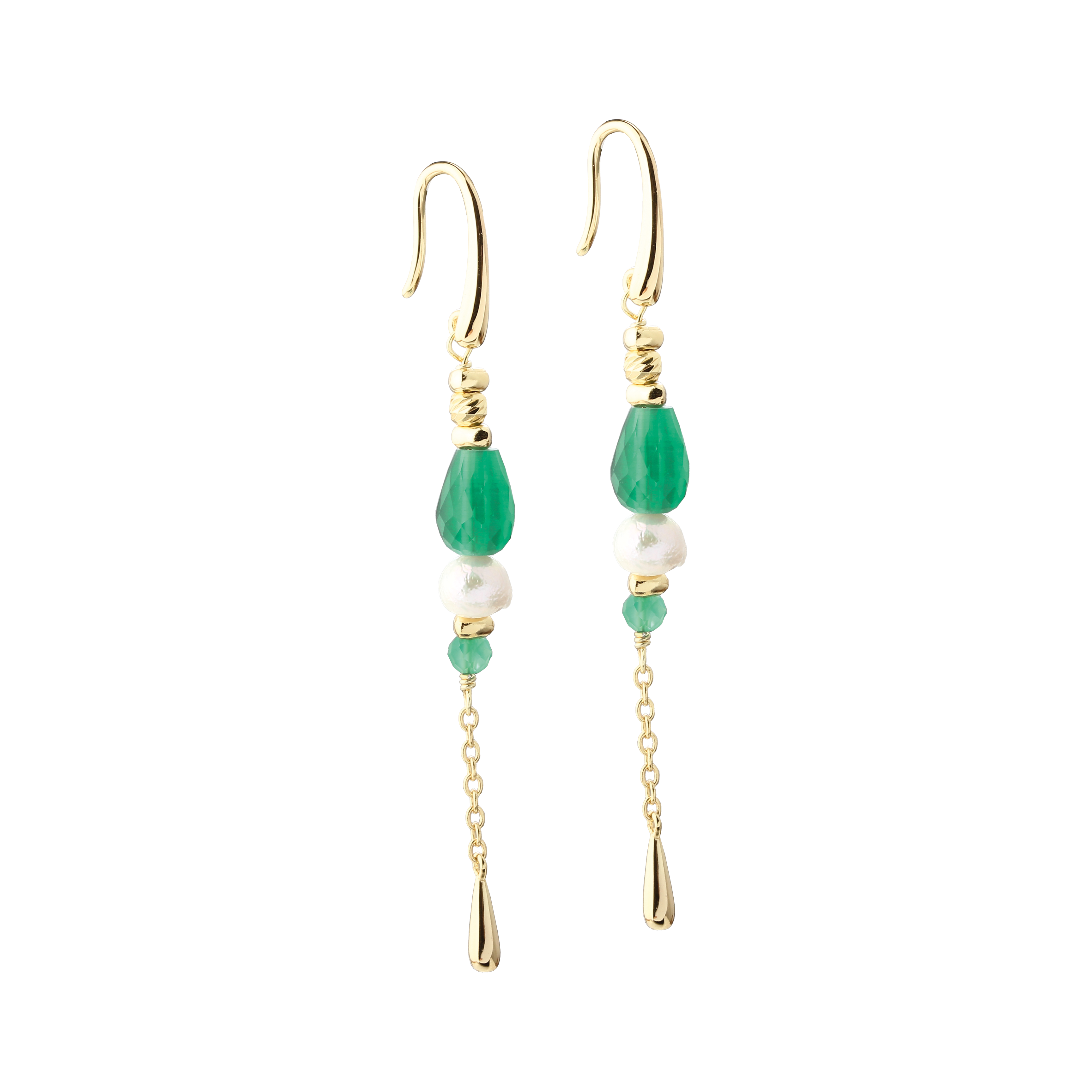 Disse VERDE DROP Earthread øreringe er et farverigt og elegant statement, der afspejler Aqua Dulces passion for farver og skinnende materialer. De dynamiske kædeøreringe er prydet med dyb grøn Onyx og smukke, naturlige ferskvandsperler. Øreringene er udført i 925 Sterling sølv og belagt med 14 karat guld.