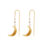 Disse elegante Summer Moon øreringe er udført i forgyldt 925 sterling sølv med en blød, mat overflade, der fanger lyset på en diskret og raffineret måde. Den fine trådkæde glider ubesværet gennem øret og skaber et let, svævende udtryk, mens den buede månesegl danner et drømmende fokuspunkt nederst. Øreringene er prydet med tre hvide perler i varierende størrelser, som tilfører et klassisk og tidløst touch.