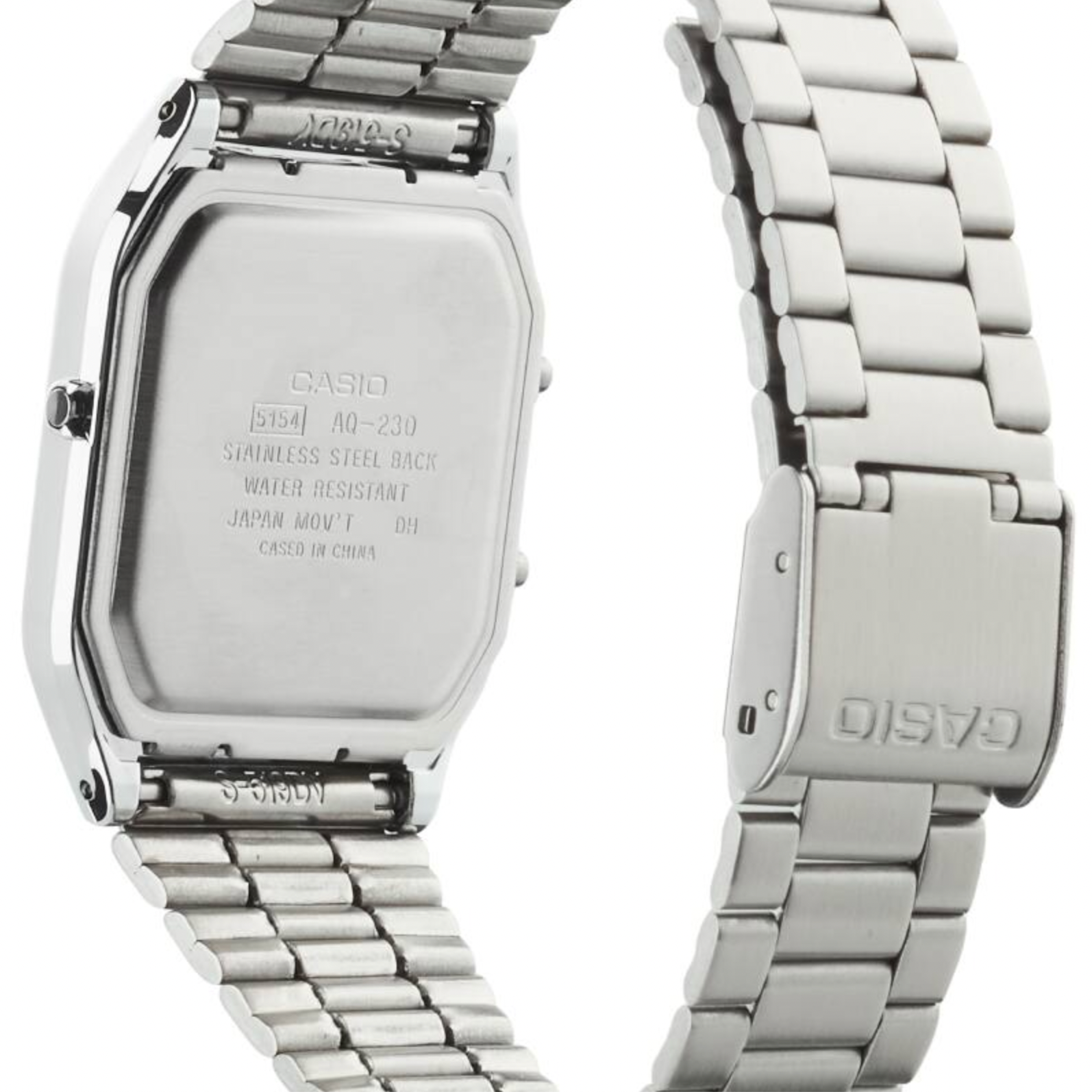 Casio Vintage AQ-230A-7DMQYES - Denne klassiske Casio-model kombinerer både analog og digital tidsangivelse, hvilket giver dig det bedste af begge verdener. Uret har en elegant hvid urskive og en lækker lænke i rustfrit stål, der tilføjer et sofistikeret touch til dit look. Med en diameter på 28 mm og en urtykkelse på 8 mm, er det både kompakt og stilfuldt. Mineralglasset beskytter skiven, mens den rustfri stålurcase sikrer holdbarhed og et tidløst design. Uret er vandtæt til 1 ATM, hvilket gør det velegnet til daglig brug, men det anbefales ikke til dykning eller svømning.