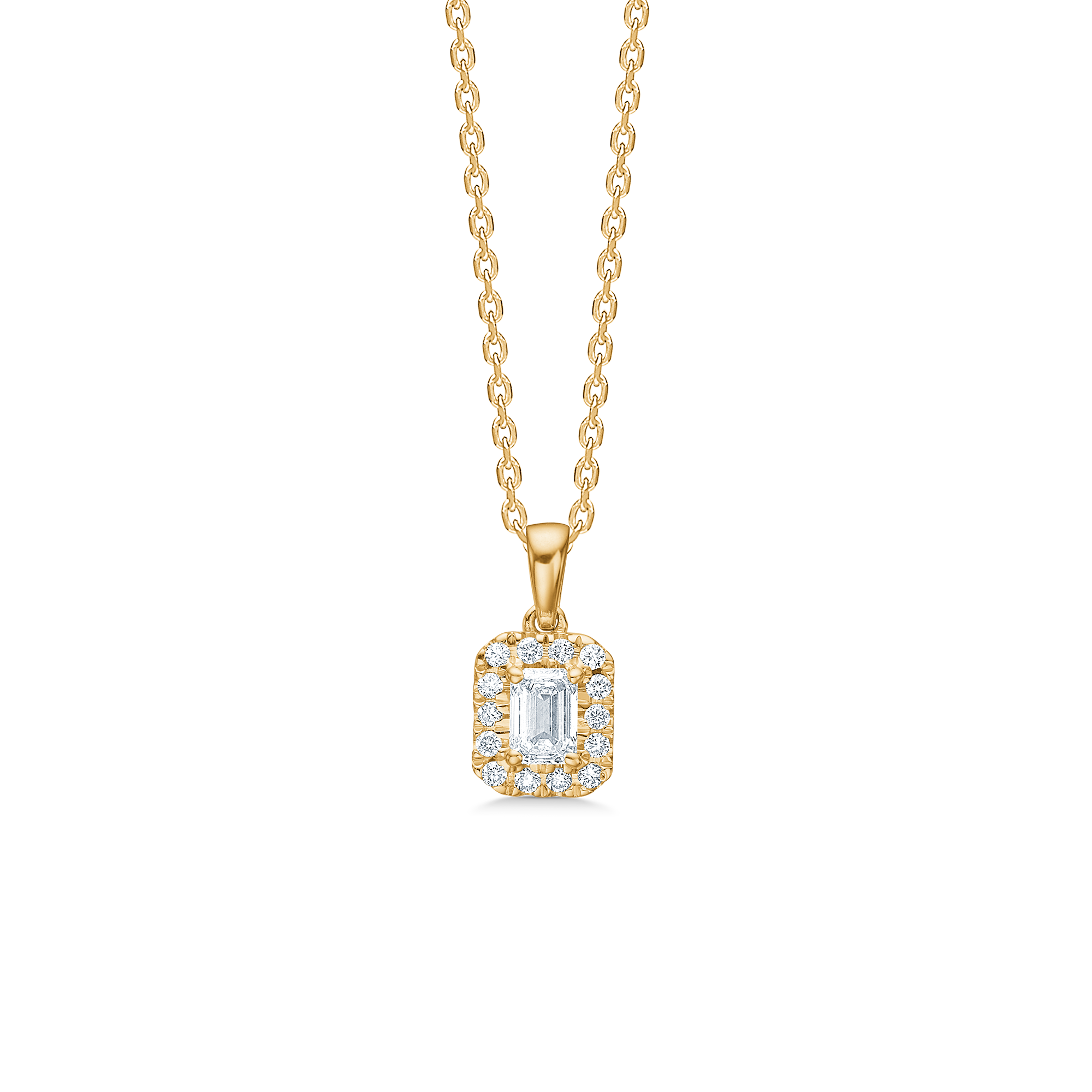 Et elegant vedhæng i 14 kt. guld med brillanter. Det aflange baguetteslebne center er smukt indrammet af funklende brillanter, som giver et eksklusivt og balanceret udtryk.