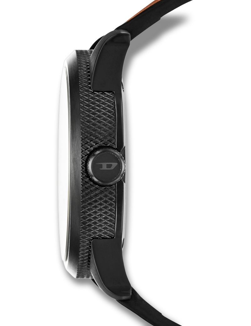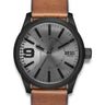 Den sorte urkasse er præget af en unik maskin-rillestruturet finish, der giver en markant tekstur og et sofistikeret udtryk. Den intense farve står i smuk kontrast til den lysebrune læderrem, hvilket tilføjer varme og tidløs elegance.