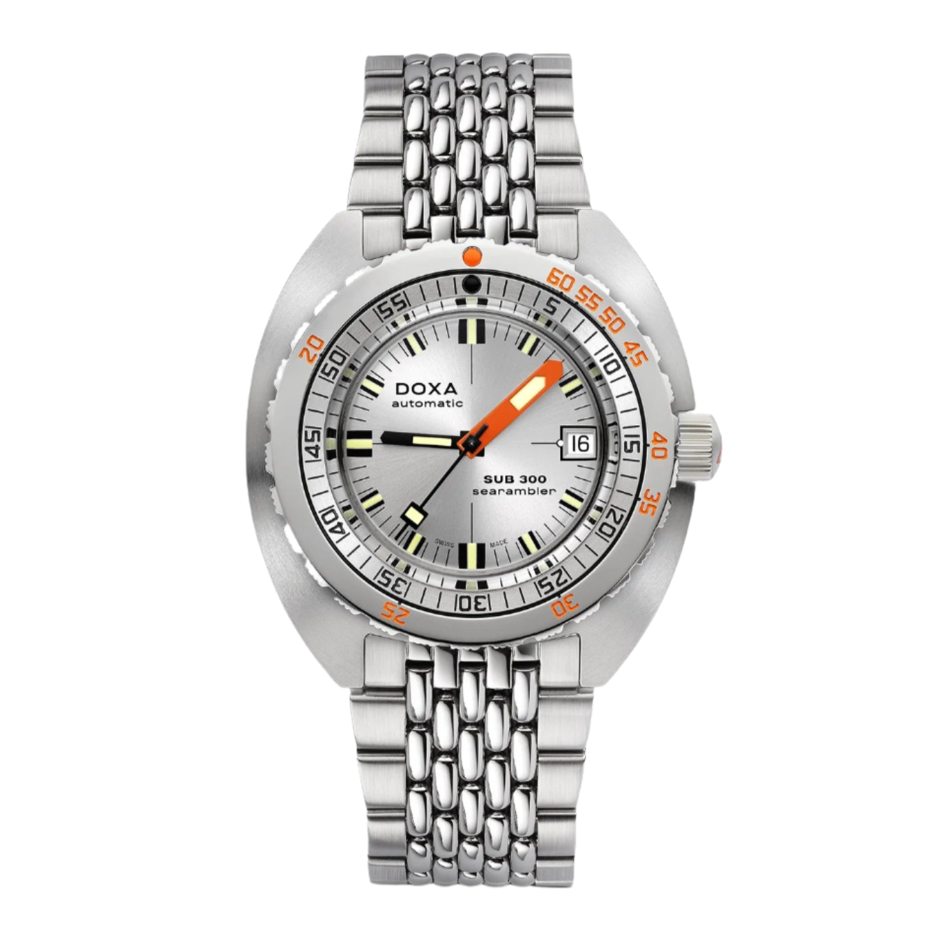 *DOXA Sub 300 Searambler COSC* bygger videre på denne arv med en 42,5 mm urkasse i 316L rustfrit stål, der kombinerer klassisk design med moderne teknologi. Uret er udstyret med et COSC-certificeret selvoptrækkende schweizisk urværk, som sikrer præcision, robusthed og pålidelighed, samt en gangreserve på 38 timer. Det har et datovindue ved kl. 3 og en skruekrone for ekstra vandbeskyttelse.