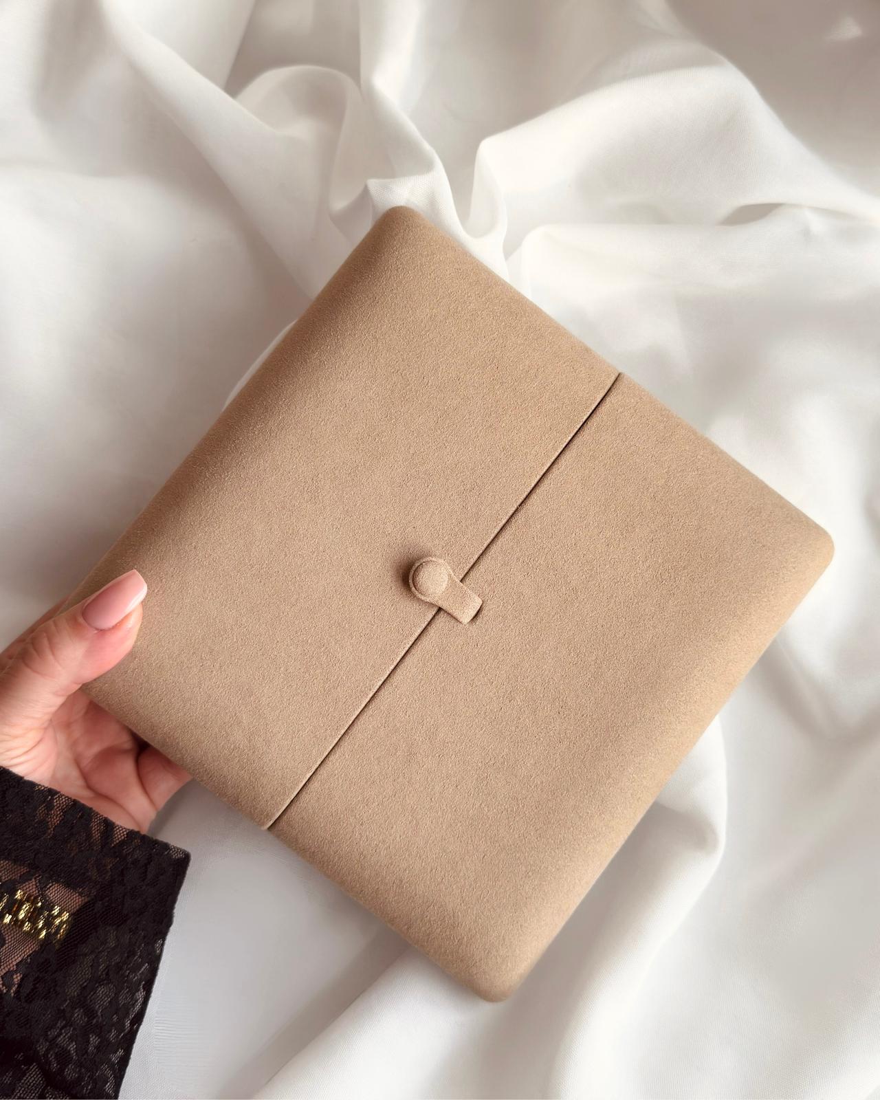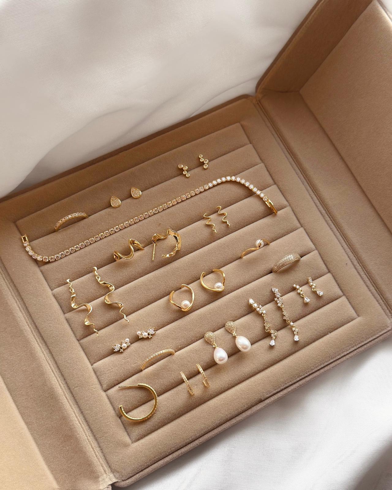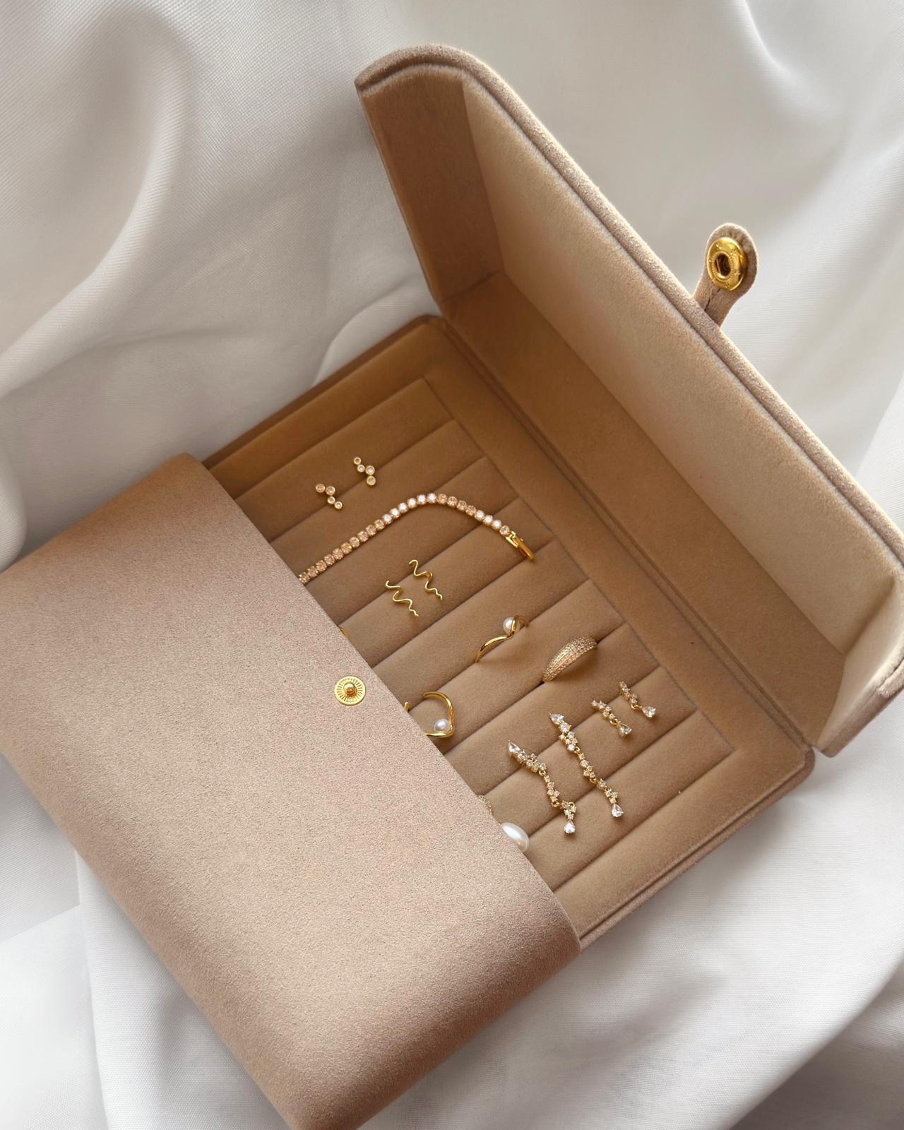 En smukt udformet opbevaringsløsning, skabt til den moderne smykkeelsker. Indretningen er gennemtænkt, så du altid har det perfekte overblik over dine favoritter. De fine rum giver plads til både øreringe og ringe, mens den elegante lukning fuldender helhedsindtrykket med et pænt og harmonisk udtryk. Et tidløst design, der kombinerer funktionalitet og finesse.