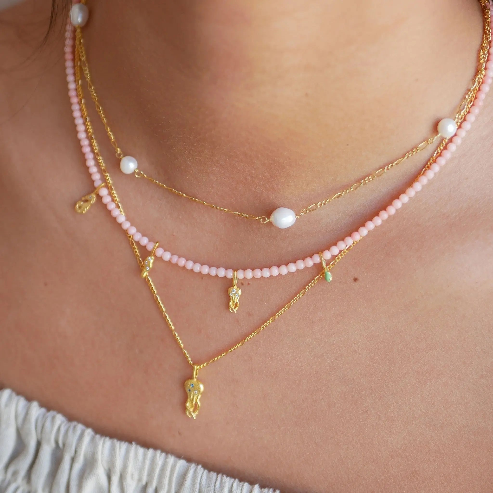 Smykket er lavet i forgyldt sterlingsølv, og vi anbefaler, at du undgår kontakt med vand for at bevare forgyldningens glans.