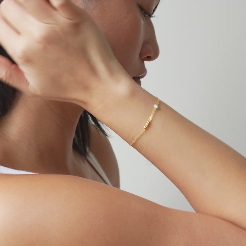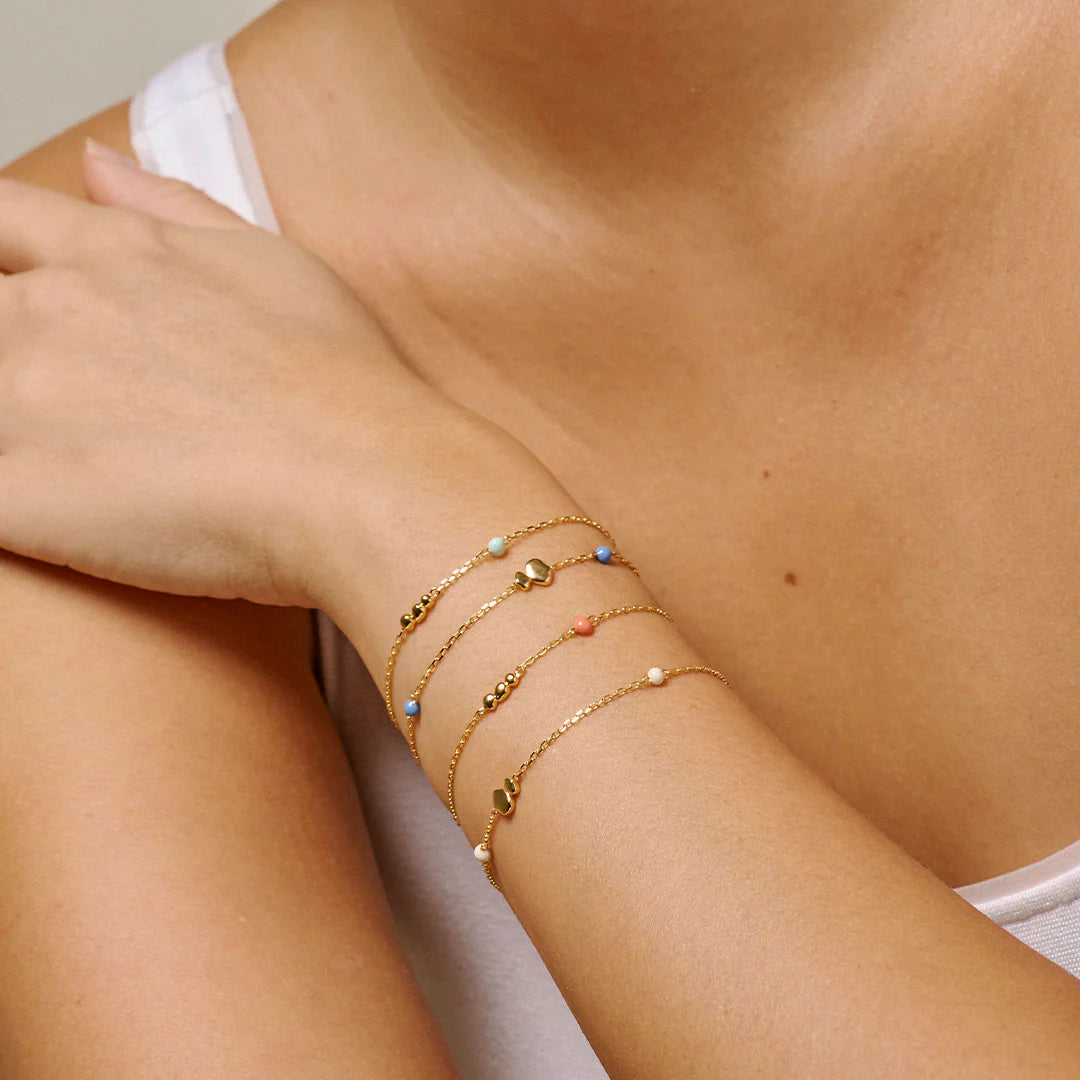 - Design: Et iøjnefaldende Enamel Nara armbånd mint, med en enkelt farverig mint emaljeperle, der giver smykket et friskt og unikt præg. Den blanke overflade fremhæver elegant forgyldningen og emaljens levende farve.
