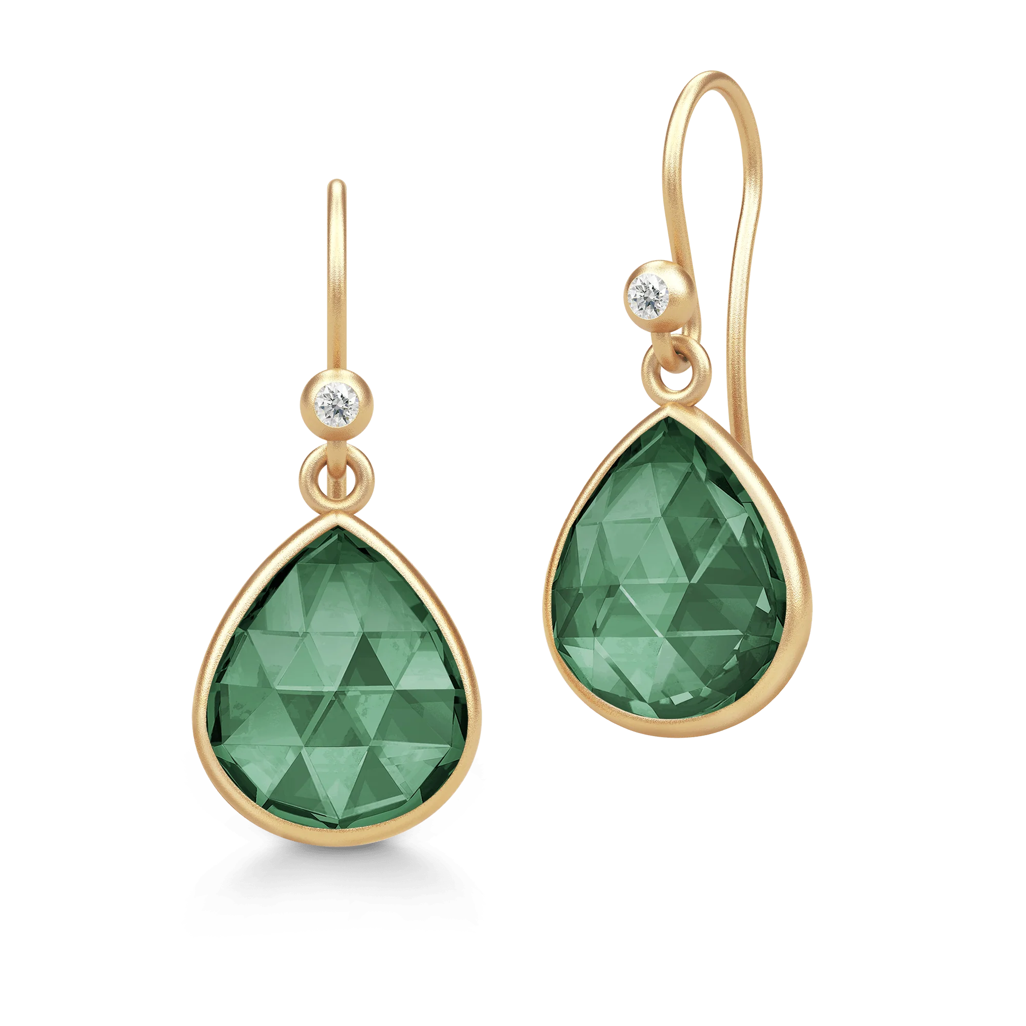 Lea øreringene kombinerer farverig elegance med klassisk finesse. De smukke dråbeformede grønne krystaller er indfattet i satinforgyldt sølv og fuldendes af en lille klar sten, der tilfører et diskret strejf af glans.