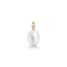 Lovina-vedhænget er skabt 14 karat guld og prydet med tre Top Wesselton-diamanter på tilsammen 0,02 carat, der kaster et diskret, raffineret skær. Midt i guldrammen hviler en oval hvid ferskvandsperle (7 × 15 mm) med et silkeblødt, perlemorsagtigt skær, som spiller smukt sammen med diamantens klarhed.