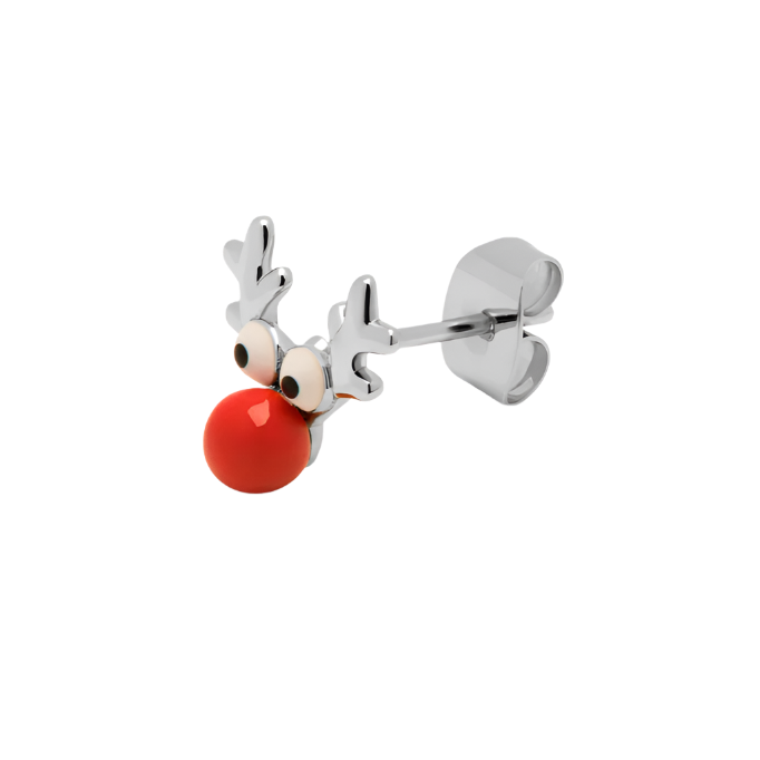 Rudolph ørestikken fra LULU Copenhagen, her i den forsølvede version, er den perfekte måde at bringe festlig stemning ind i din smykkesamling. Med sin finurlige silhuet, der fanger essensen af julen, prydes denne ørestik med karakteristiske rensdyr ører, store øjne og en iøjnefaldende rød næse, der gør den til et sandt blikfang.
