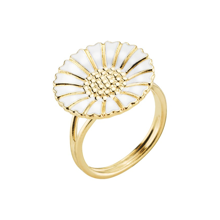 Denne fine ring er fra brandet Lund Copenhagen. Ringen er udført i forgyldt sterlingsølv og prydet med en fin marguerit med en hvid emalje. Marguerittens størrelse er 18 mm.