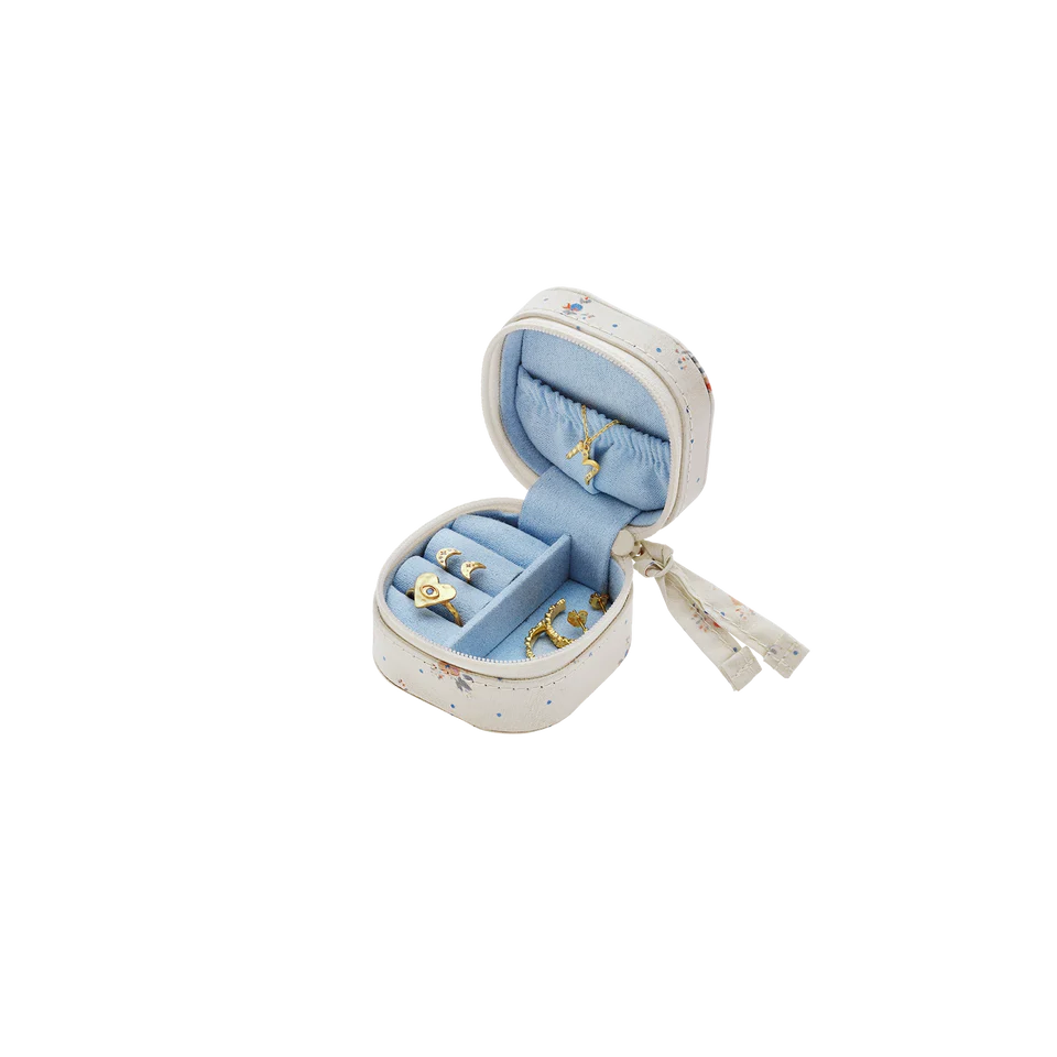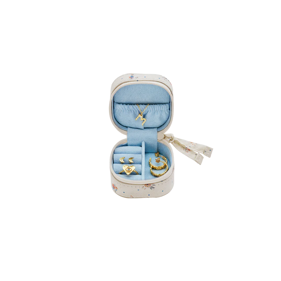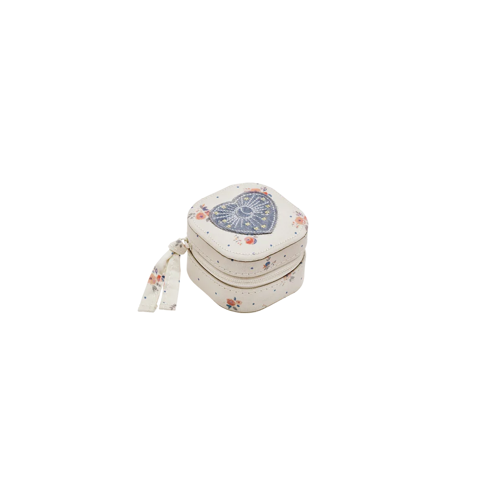 Alice Smykkeskrin er sødt og kompakt, skabt til at holde dine kæreste skatte nær og beskytte dem. Med et charmerende hjerte broderet på låget er det lille skrin perfekt til dine mindste ejendele – uanset om du er ude eller hjemme. Det udvendige materiale er en blanding af bomuld, polyester og hør/bomuld/viscose, foret er 100% polyester, og lynlåsen er en genanvendt YKK Nautilon lynlås. Et yndigt og praktisk valg fra Maanesten.