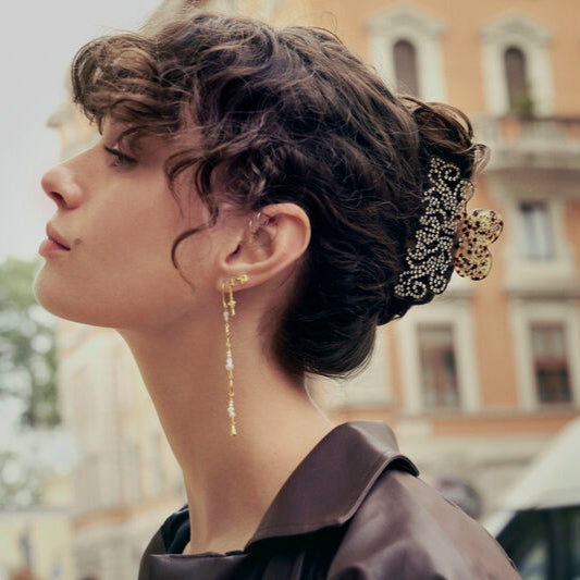 Elith Hårklemme i farven Sesame er en smuk og funktionel accessory, der kombinerer praktisk anvendelighed med Maanestens legende æstetik. Den elegante hårklemme er dekoreret med funklende detaljer, der giver et feminint og eksklusivt udtryk, samtidig med at den er perfekt til at holde håret på plads i både hverdagen og til festlige anledninger.