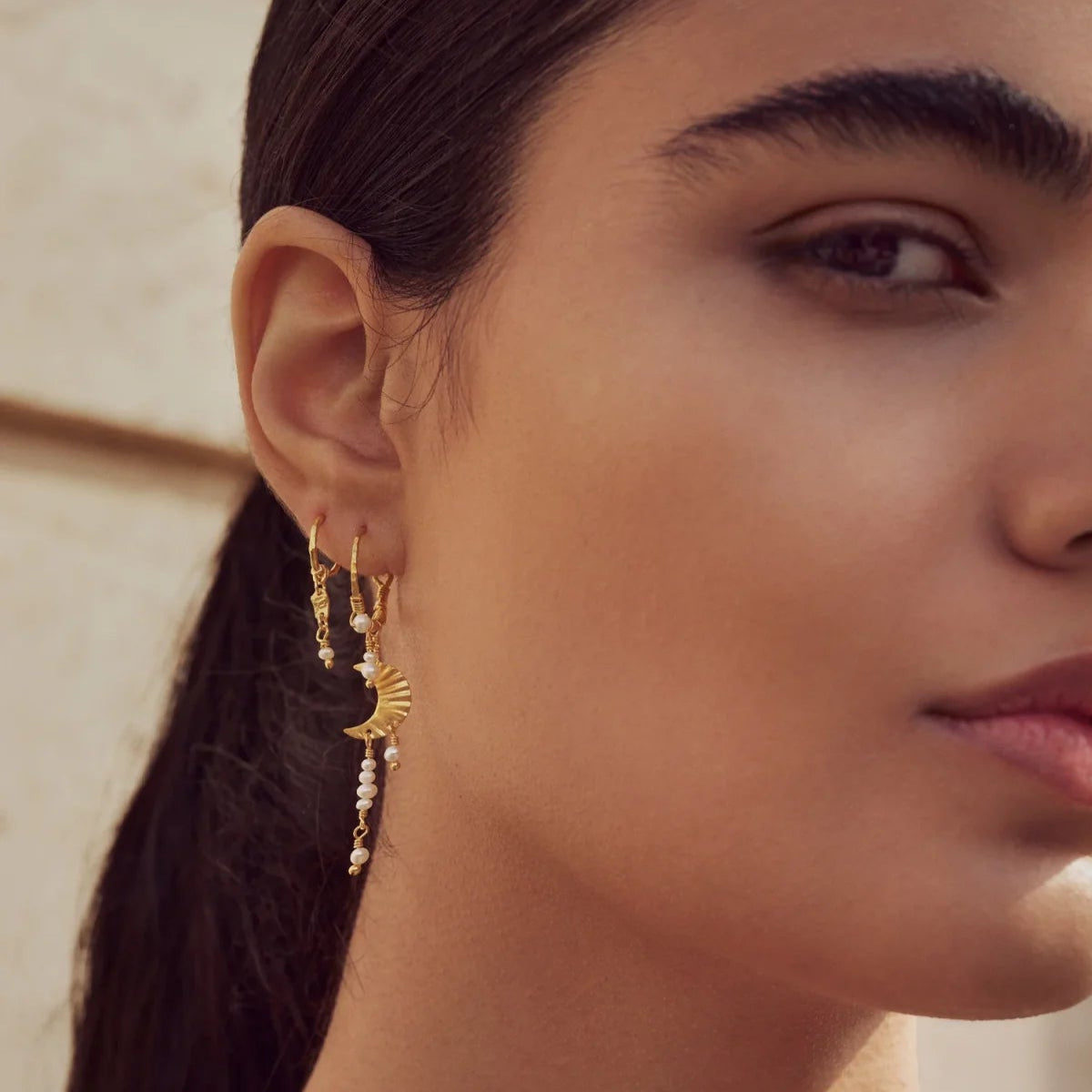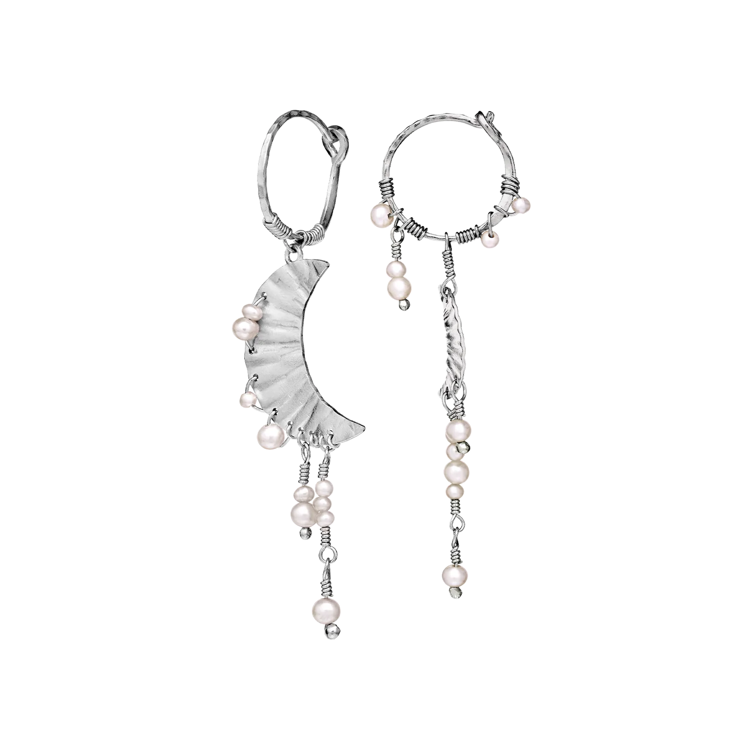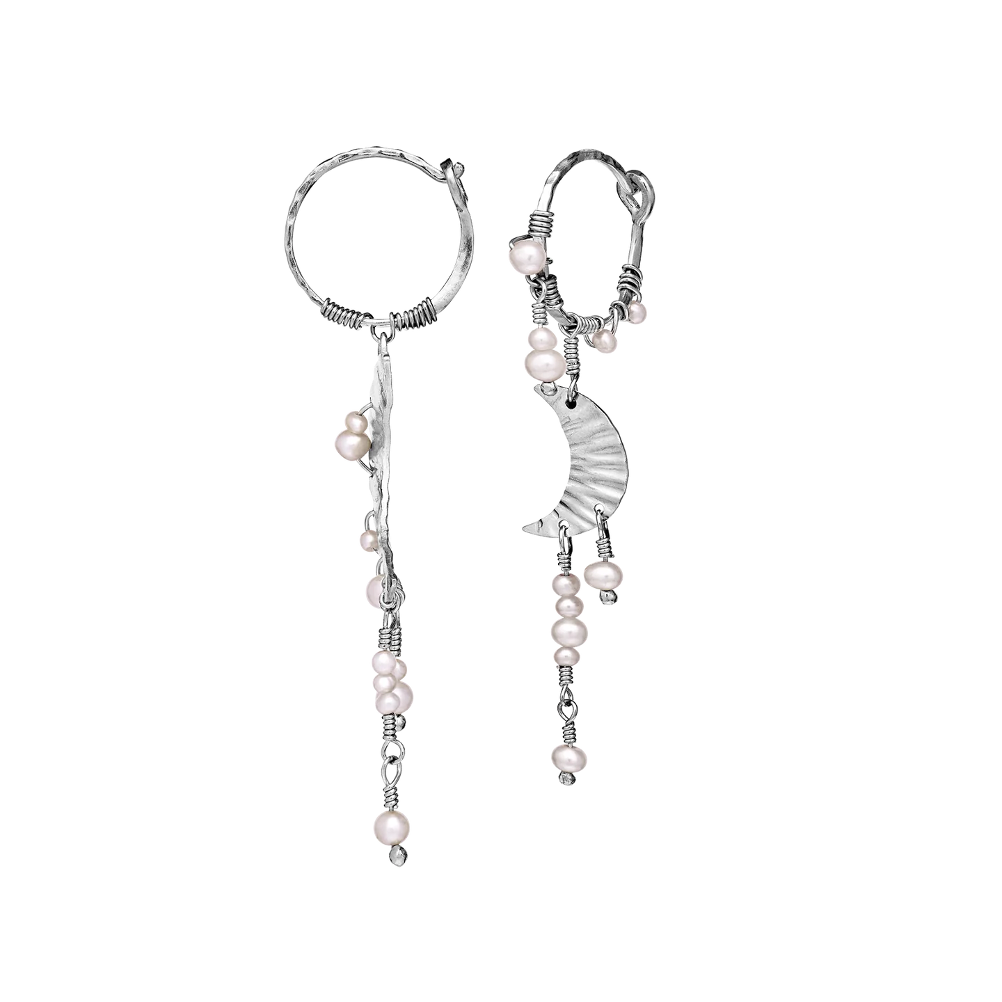 Esta øreringene afbilde to strålende måner, der drypper med ferskvandsperler som frostdråber i natten. De er udført i genanvendt sterling sølv (925).