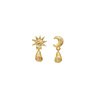 Lainy øreringene fra Maanesten kombinerer sol og måne i et legende og drømmende design. De små dråbeformede vedhæng med champagnefarvede zirkoner hænger elegant fra hvert himmelsk symbol og tilføjer et glimt af varme og bevægelse til looket.