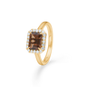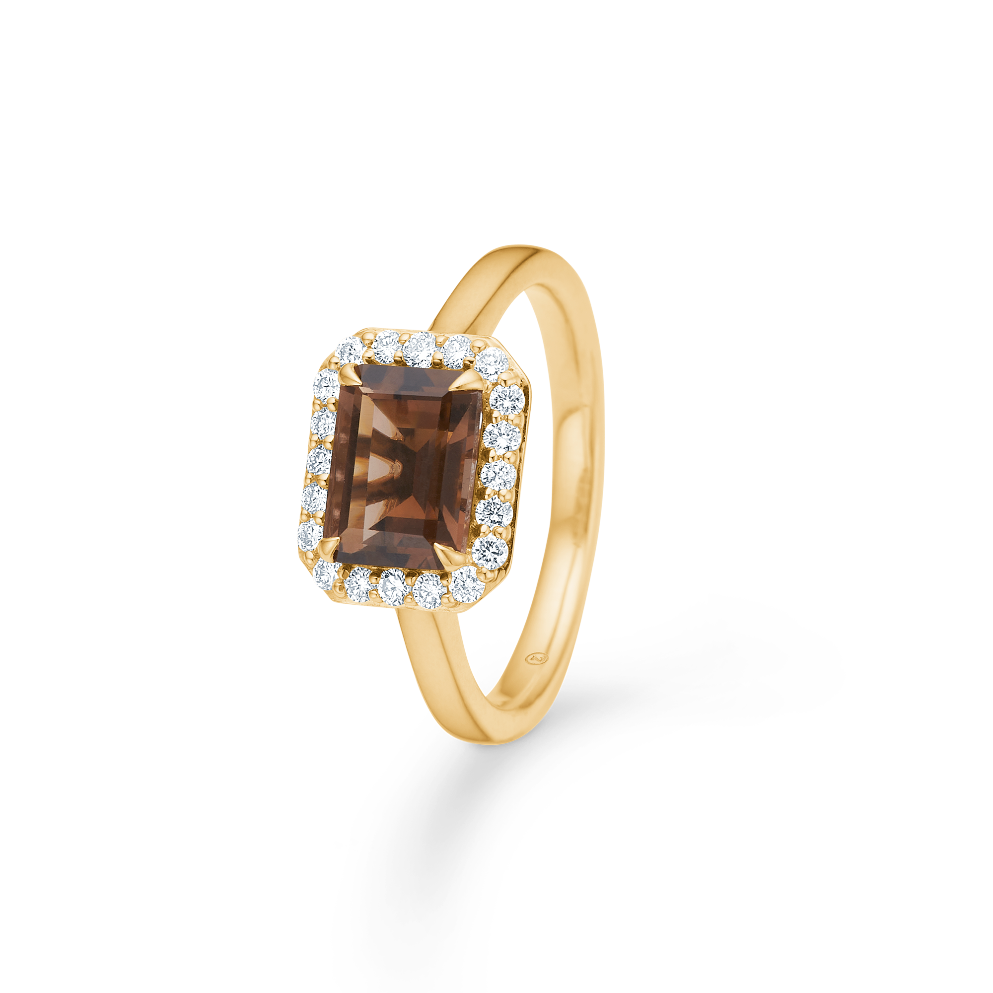 Ringen er fremstillet af 14 karat guld og har en stor, emeraldslebet røgkvarts som centrum. Denne ædelsten indrammes smukt af en halo af 20 pavé-satte brillantslebne diamanter på i alt 0.25 ct. W.SI, som skaber en strålende kontrast til den dybe cognacfarvede røgkvarts. Smykket er et smukt samspil mellem præcise linjer og bløde kurver, der giver et roligt og balanceret udtryk.