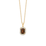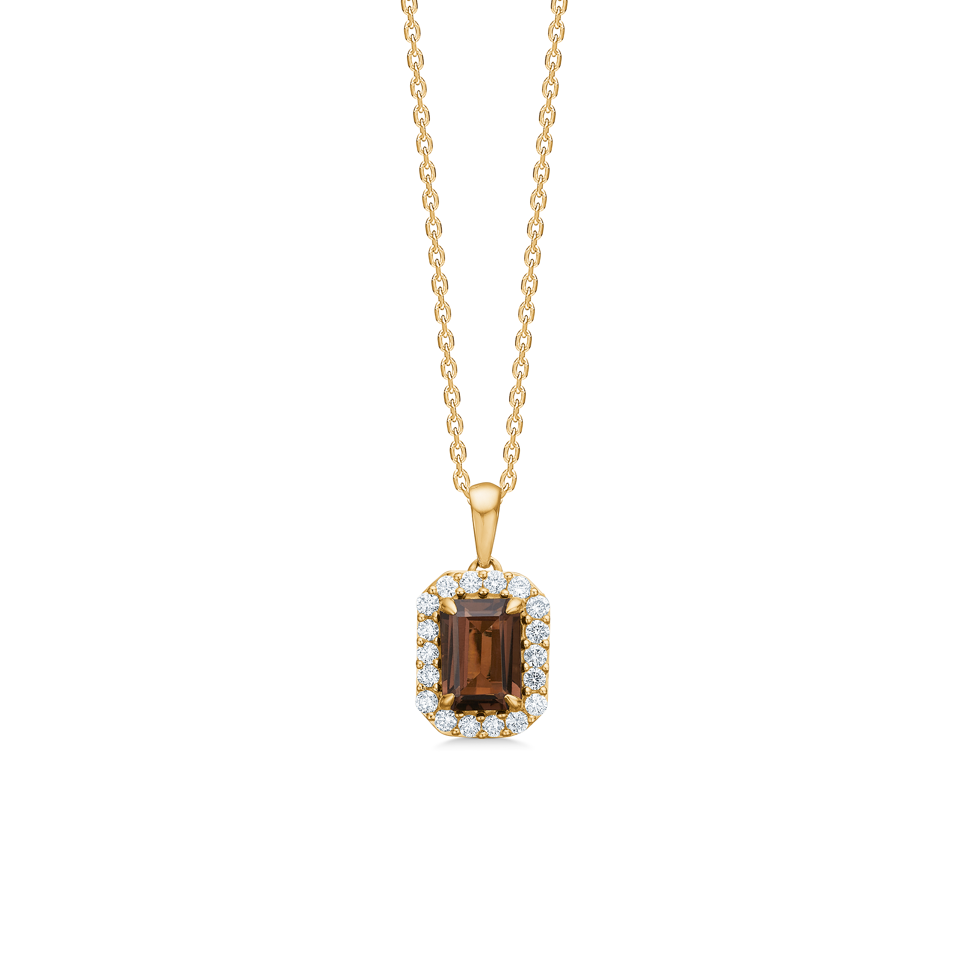 Vedhænget er fremstillet af 14 karat guld, hvor en stor, emeraldslebet røgkvarts er smukt indrammet af en halo af pavé-satte, brillantslebne diamanter på i alt 0.22 ct. W.SI. Kombinationen af den cognacfarvede røgkvarts og den strålende diamanthalo skaber en smuk kontrast. Hver detalje vidner om den høje Gold Label-kvalitet og solidt dansk guldsmedehåndværk.