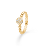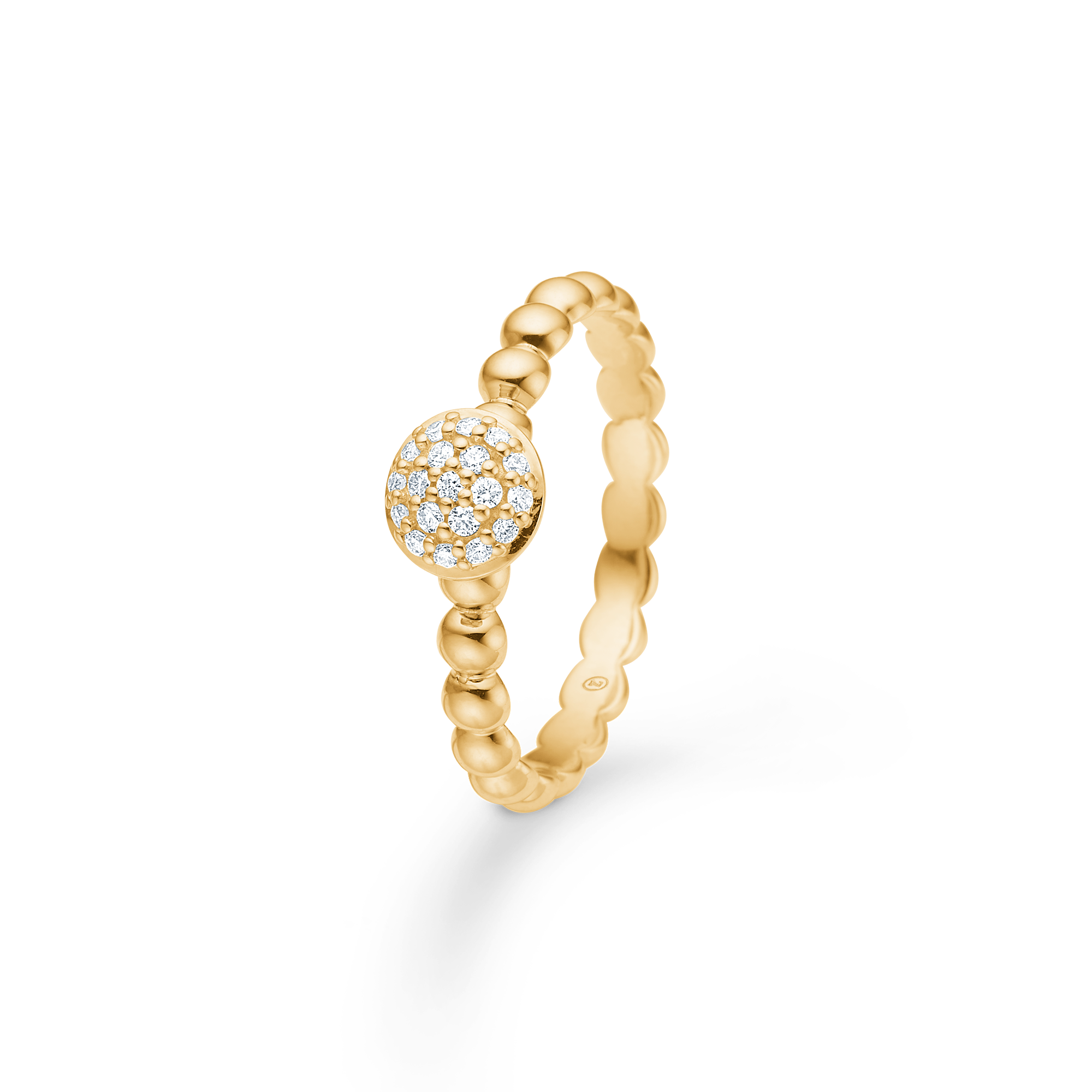 Ringen er lavet af SMO-certificeret guld, som garanterer ansvarlige materialer og varig værdi. Den er udsmykket med en kuppelformet top, der er pavébesat med brillantslebne diamanter på i alt 0.10 ct. W.SI. Kombinationen af 14 karat guld, de omhyggeligt fastsatte diamanter og den detaljerige pavéteknik giver ringen et moderne udtryk.