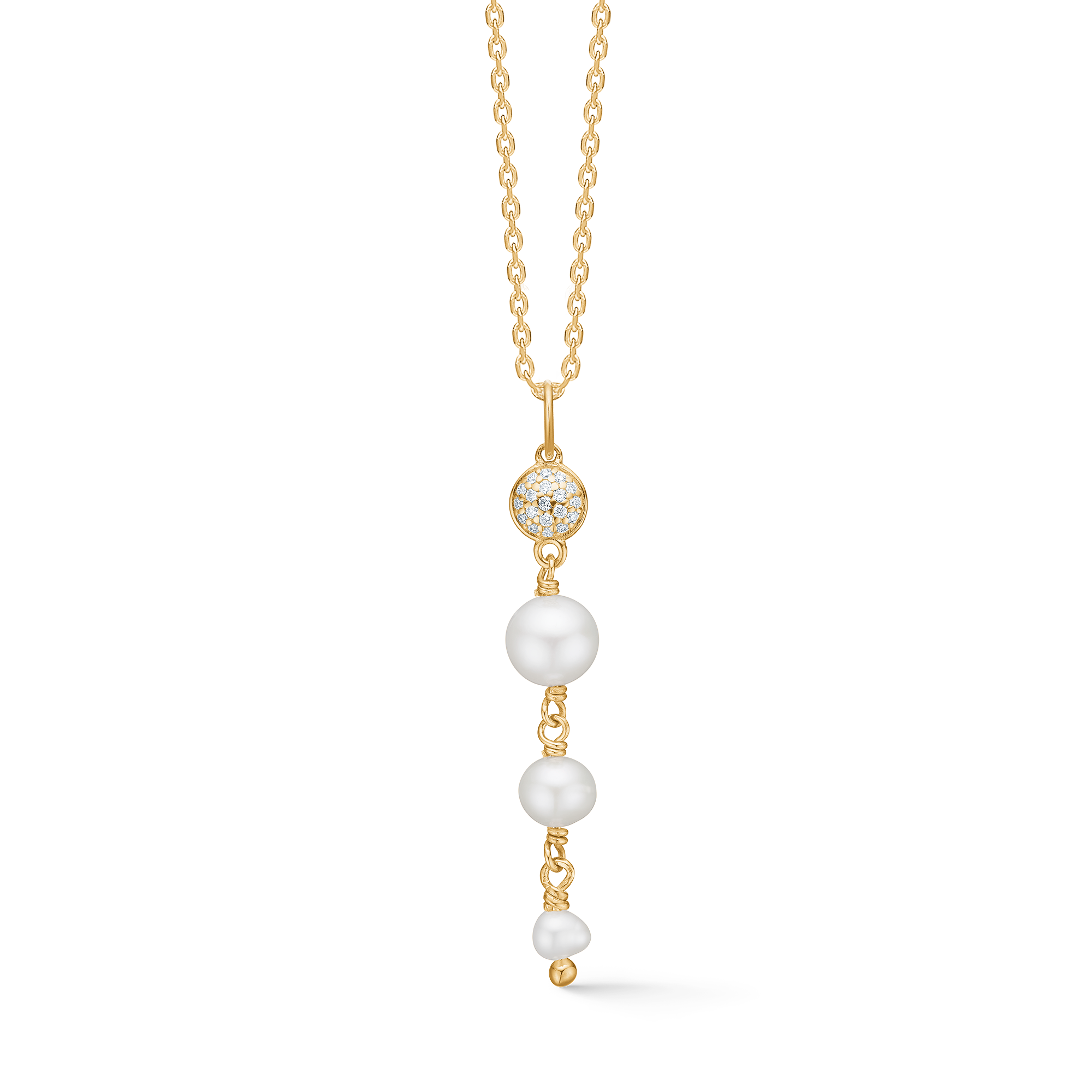Vedhænget er lavet af 14 karat guld, hvor den øverste, kuppelformede top er pavé-sat med brillantslebne diamanter på i alt 0.07 ct. W.SI. Diamanternes klare skær reflekterer lyset og skaber en smuk kontrast til perlernes rolige glød. Smykket er et smukt samspil mellem streng geometri og organiske former, og det er udført med dansk guldsmedekvalitet og et vedvarende fokus på detaljen.