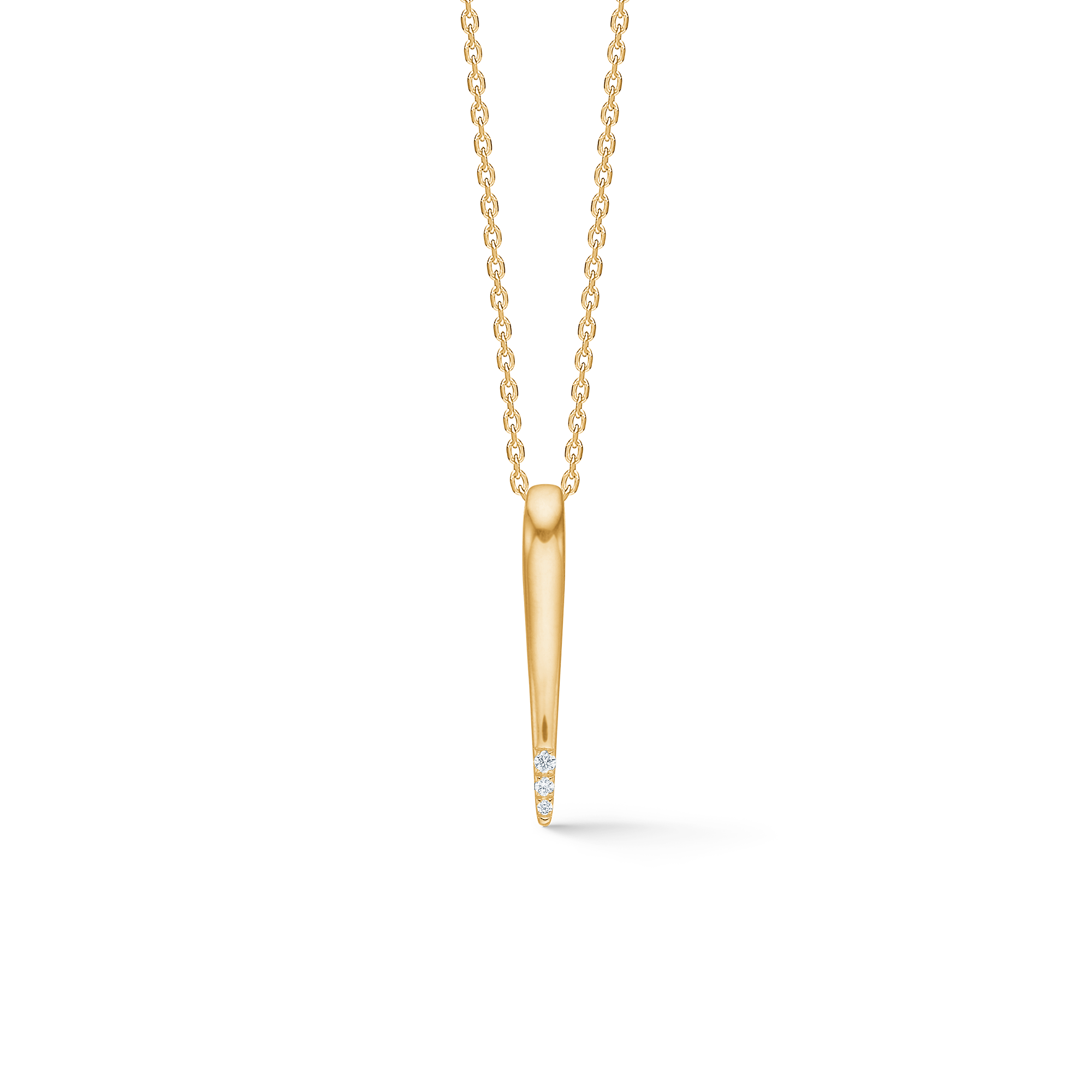 Vedhænget er fremstillet af SMO-certificeret 14 karat guld (måler 20 mm), hvilket understreger den kompromisløse kvalitet og etiske standard. Det er prydet med tre brillantslebne diamanter på i alt 0.016 ct. W.SI, som er diskret indfattet i en lineær grabbefatning. Diamanterne tilføjer en subtil, glimtende lethed, der fremhæver bærerens personlige udstråling. Det raffinerede guldsmedehåndværk og den minimalistiske præcision skaber et varigt signatursmykke.