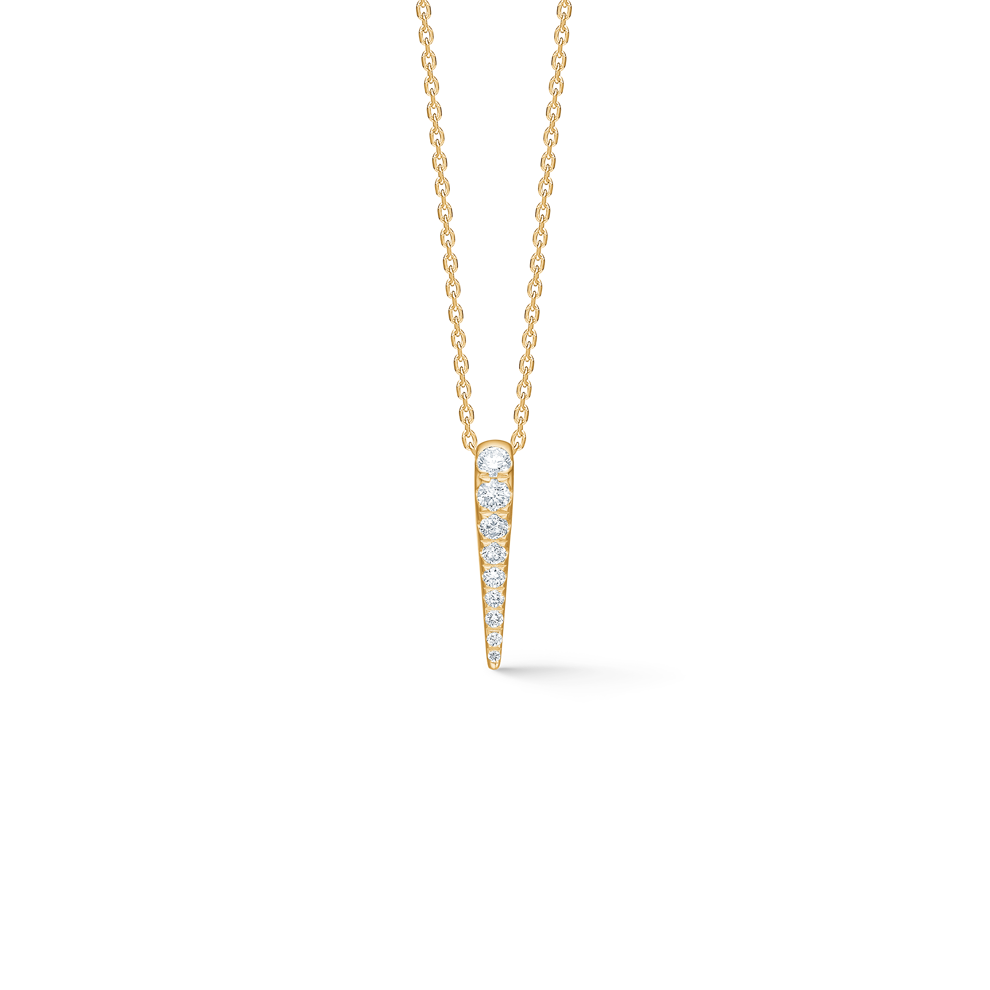 Vedhænget er et smukt samspil mellem den langstrakte silhuet og de graduerede diamanter, som reflekterer lyset forskelligt og skaber et levende udtryk. Den detaljerede grabbefatning og den omhyggelige polering understreger den kompromisløse guldsmedekvalitet, der er kendetegnende for Gold Label-kollektionen.