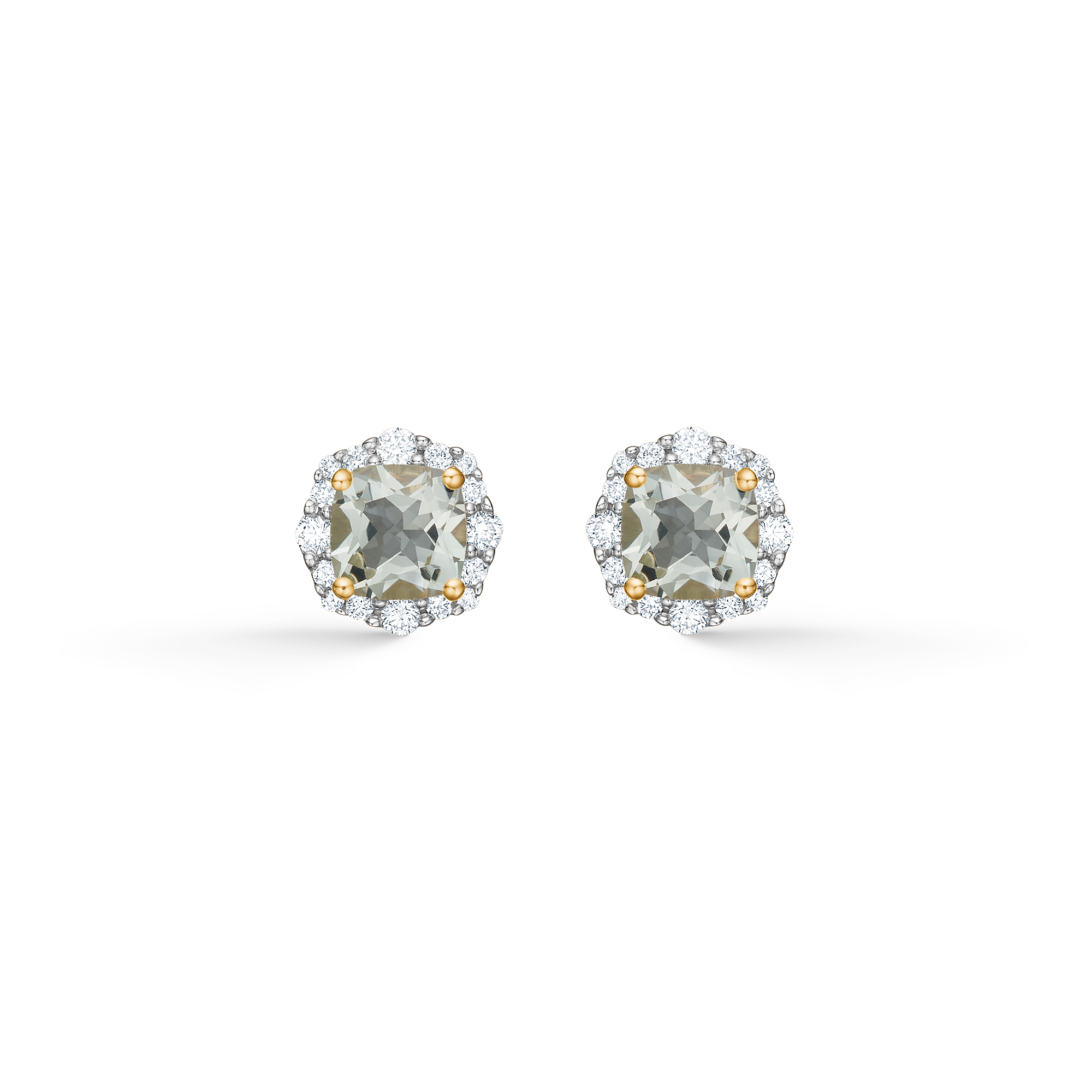 Øreringene er fremstillet af 14 karat guld og har en smuk, lysegrøn ametyst som centrum. Den mintgrønne farve symboliserer ro og fornyelse. Amestysten er smukt indrammet af et bånd af brillantslebne diamanter på i alt 0.22 ct. W.SI. Den detaljerede grabbefatning fremhæver stenens glans og skaber en smuk halo-effekt, der forstærker lyset og farverne i stenen.