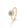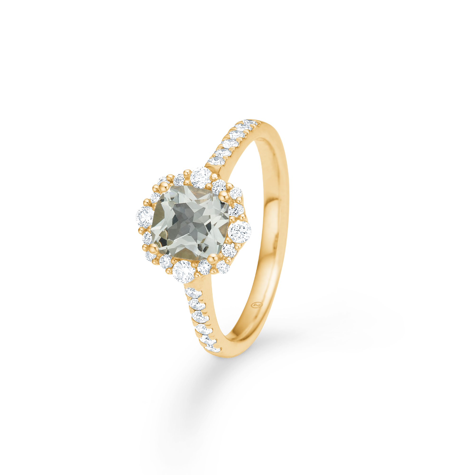 Ringen er fremstillet af 14 karat guld og har en facetsleben, lysegrøn ametyst som centrum. Ametysten symboliserer ro og fornyelse, og er smukt indrammet af et diskret bånd af brillantslebne diamanter på i alt 0.33 ct. W.SI. Dette skaber en halo-effekt, der forstærker lyset og farverne i stenen. Ringen er et eksempel på kompromisløs kvalitet og tydelig passion for detaljen.