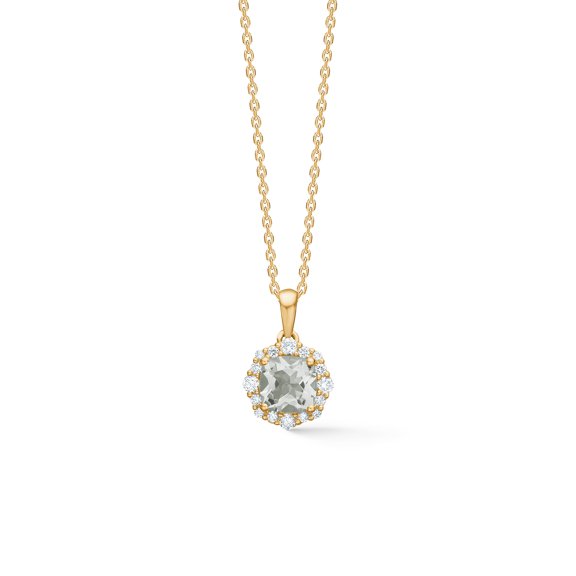 Vedhænget er fremstillet af 14 karat guld og har en smuk, grøn facetsleben ametyst som centrum. Den lyse, mintgrønne farve symboliserer ro og fornyelse, og ametysten er smukt indrammet af et bånd af brillantslebne diamanter på i alt 0.18 ct. W.SI. Dette skaber en smuk halo-effekt, der forstærker lyset og farverne i stenen. Vedhænget er et eksempel på kompromisløs kvalitet og en tydelig passion for detaljen.