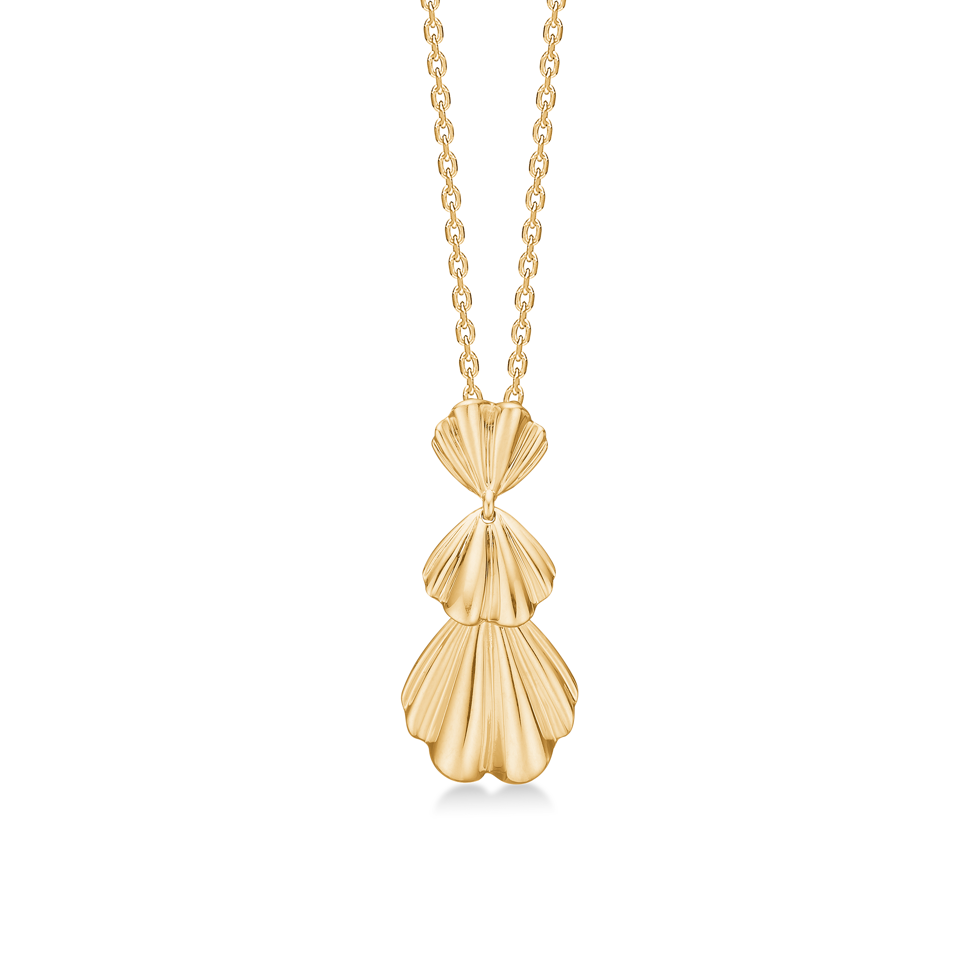 Vedhænget er fremstillet af 14 karat guld, hvor et tredelt, let plisseret motiv skaber en dynamisk karakter. Hver fold er omhyggeligt poleret, så den fanger lyset forskelligt og tilfører en diskret dybde. Denne detalje understreger den høje guldsmedekvalitet, der er kendetegnende for smykket.