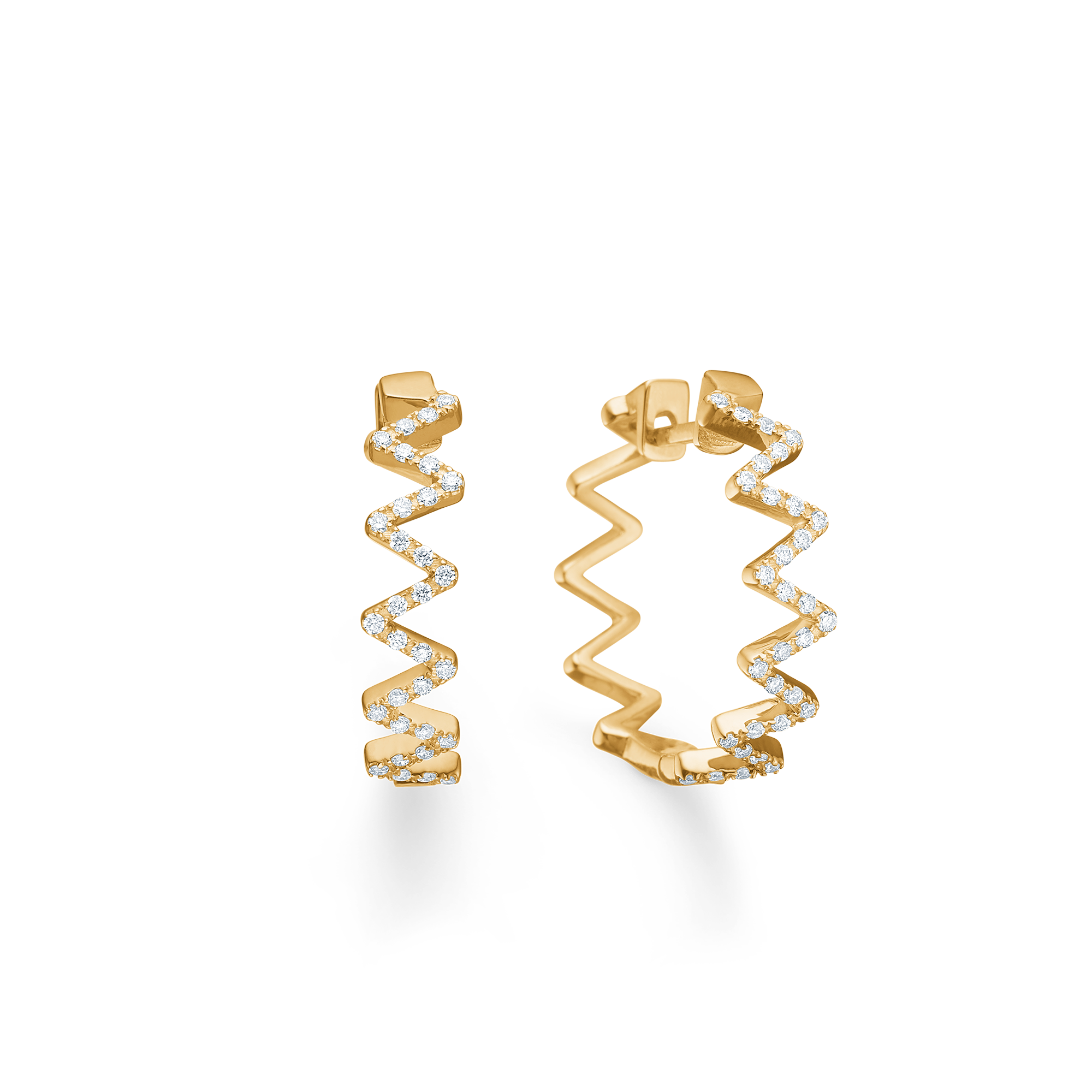Øreringene er fremstillet af poleret 14 karat guld i en markant zigzag-form, der giver en kantet, moderne karakter. Den grafiske creolprofil (måler 17 mm) har en række pavé-satte brillantslebne diamanter på i alt 0.20 ct. W.SI langs midtersegmentet. Disse diamanter følger profilens knæk og skaber et subtilt, rytmisk lys. Øreringene er et eksempel på Gold Label-kvalitet med kompromisløst fokus på raffineret håndværk og varig værdi.