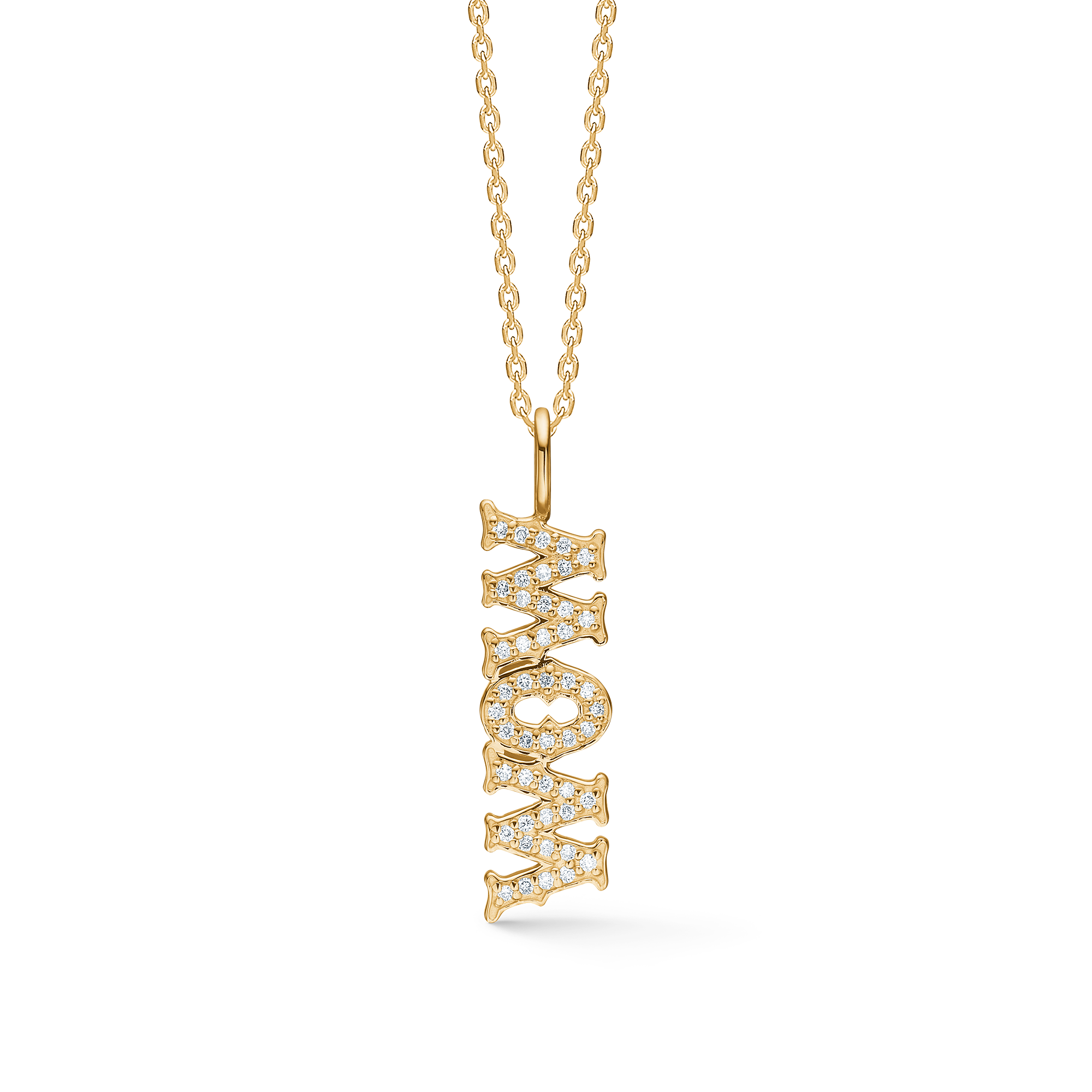 Vedhænget er fremstillet af 14 karat guld og er pavé-sat med brillantslebne diamanter på i alt 0.15 ct. W.SI. Den præcise, laserskårne kontur giver et skarpt og moderne udtryk, mens den polerede guldflade løfter det symbolske budskab. WOW-siden udtrykker beundring og fanger livets højdepunkter, mens MOM-siden hylder moderskabet og fremhæver samhørighed.