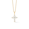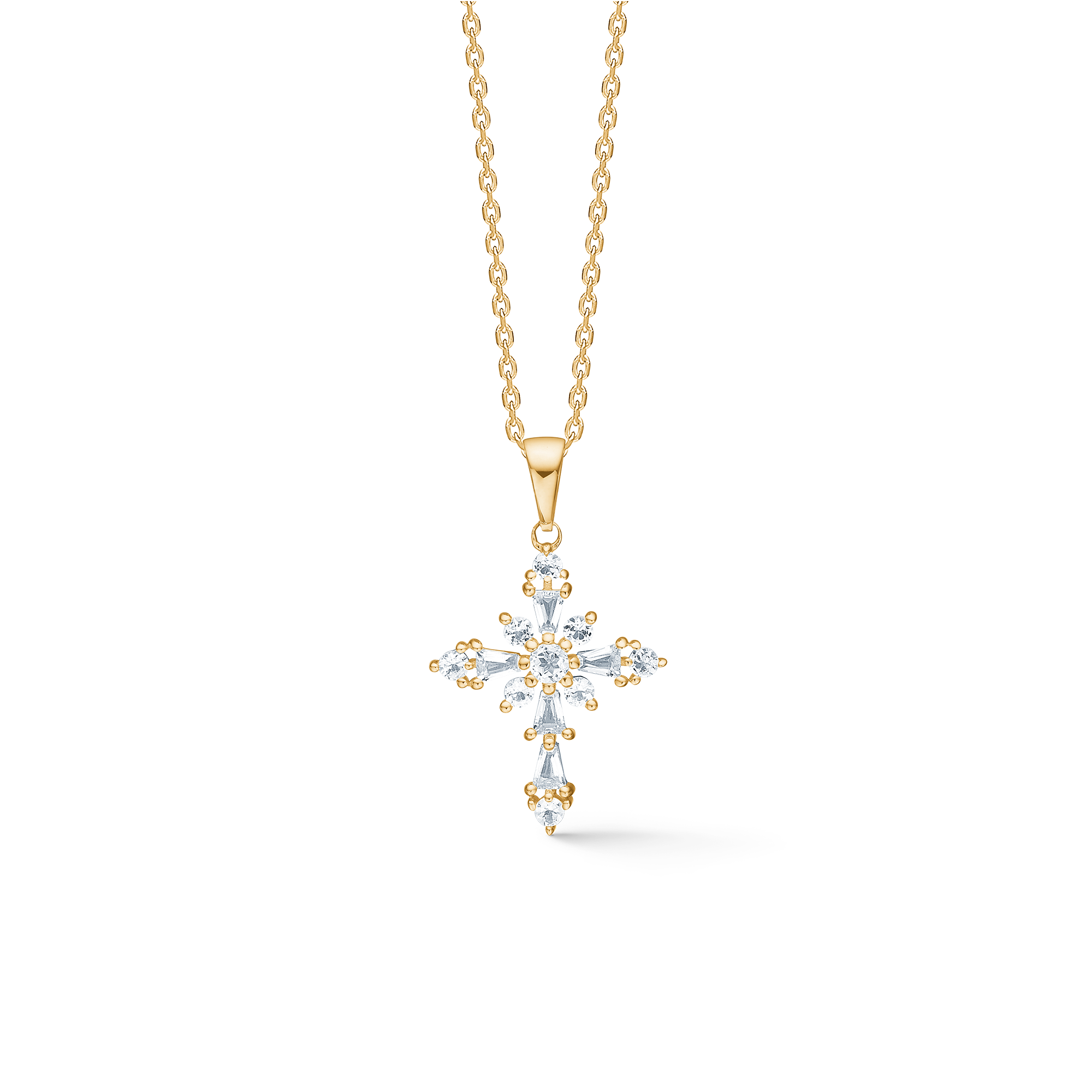 Vedhænget er udført i 8 karat guld, formet som en stiliseret stjerne eller et kryds. Denne form er valgt for at symbolisere himlens retningssans og den vejledende tilstedeværelse af stjerner. De hvide, facetslebne topaser er præcist grabbesat og fanger lyset på en måde, der skaber en fortryllende kontrast til guldet og understreger smykkets grafiske linjer. Topaserne, der symboliserer klarhed, minder os om vigtigheden af at navigere efter vores egne værdier.