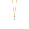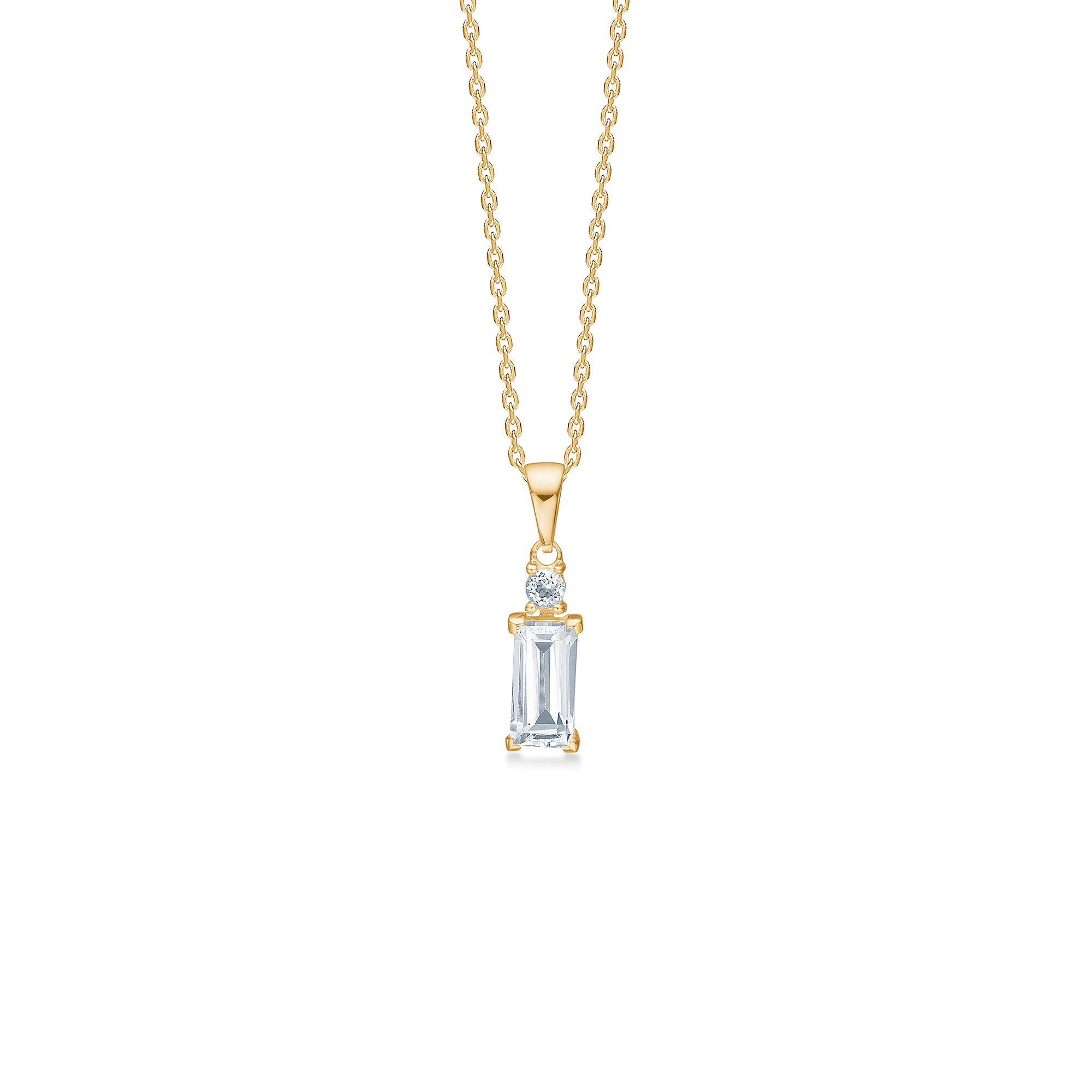 Vedhænget (måler 12 mm) er udført i 8 karat guld og har et smukt, geometrisk design. En rektangulær, facetsleben topas er elegant balanceret af en rund, hvid topas. Stenene er sat i en åben grabbefatning, som lader lyset cirkulere frit omkring hver facet, hvilket forstærker deres glans. Selve halskæden er en ankerkæde i forgyldt sterlingsølv, der komplementerer vedhænget.