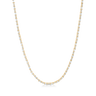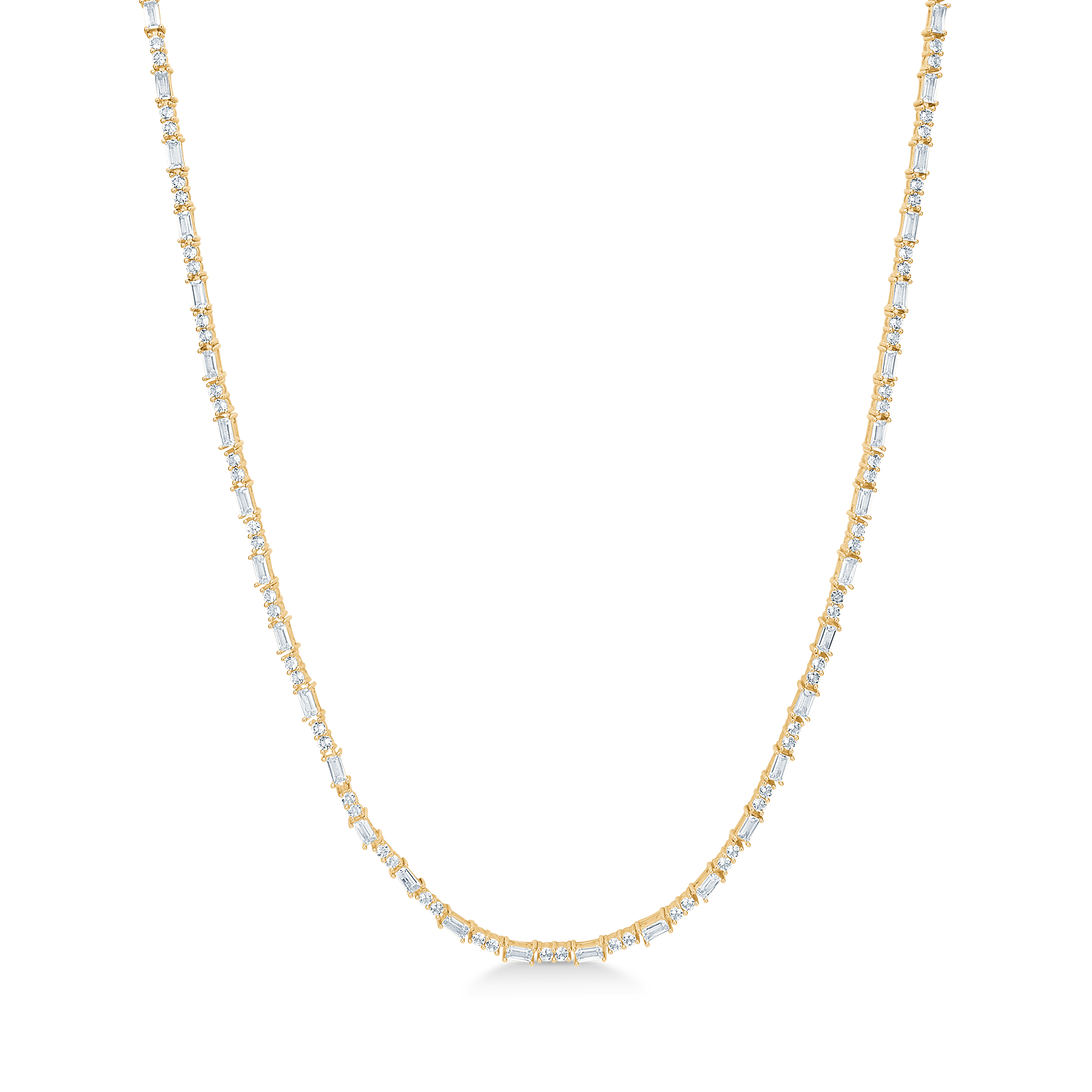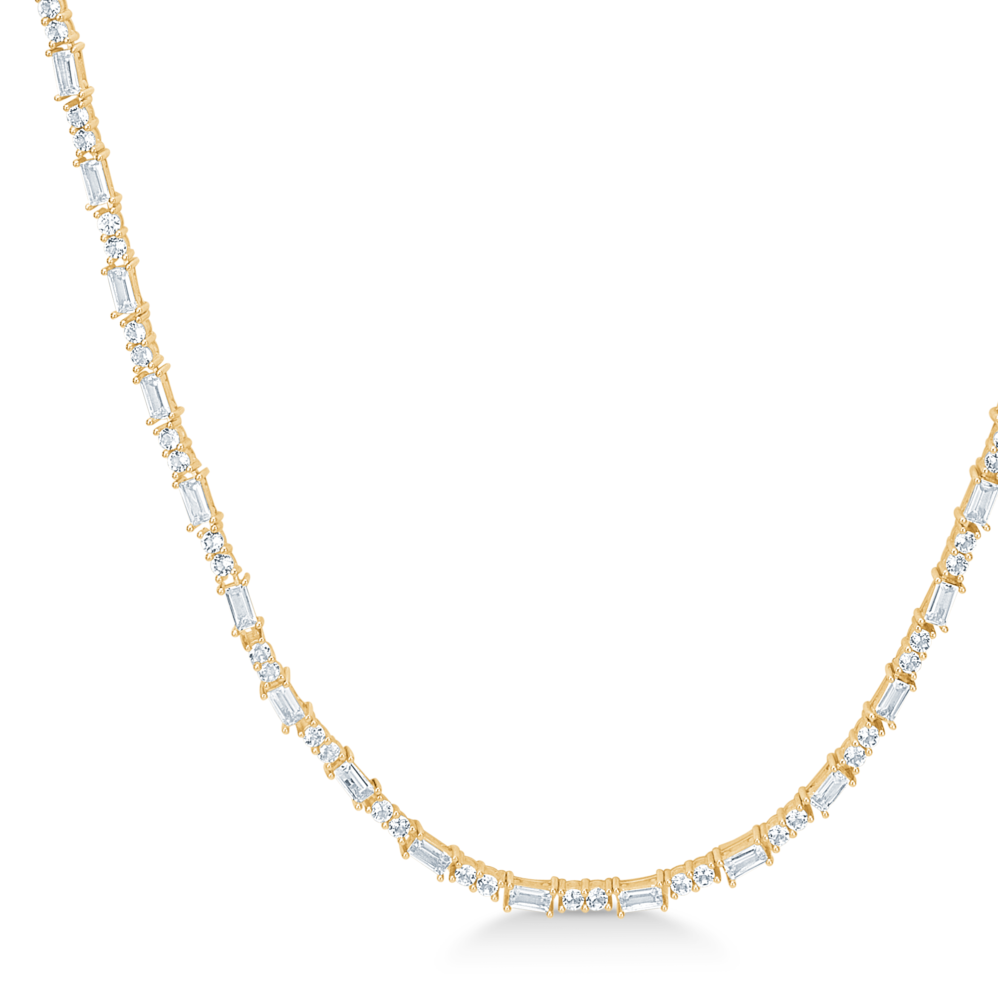 Halskæden er fremstillet af 8 karat guld og prydet med facetslebne klar hvid topas. Ædelstenene, som skiftevis er baguette- og rundslebne, danner en rytmisk, harmonisk profil. Hver topas er individuelt håndsat i åben grabbefatning, hvilket får dem til at fremstå som stjerner i et roligt kredsløb, mens fatningen sikrer en tidløs glans og blid lysrefleksion. Halskædens graduerede opbygning tilfører karakter, og dens længde kan justeres fra 38,5 cm til 45 cm.