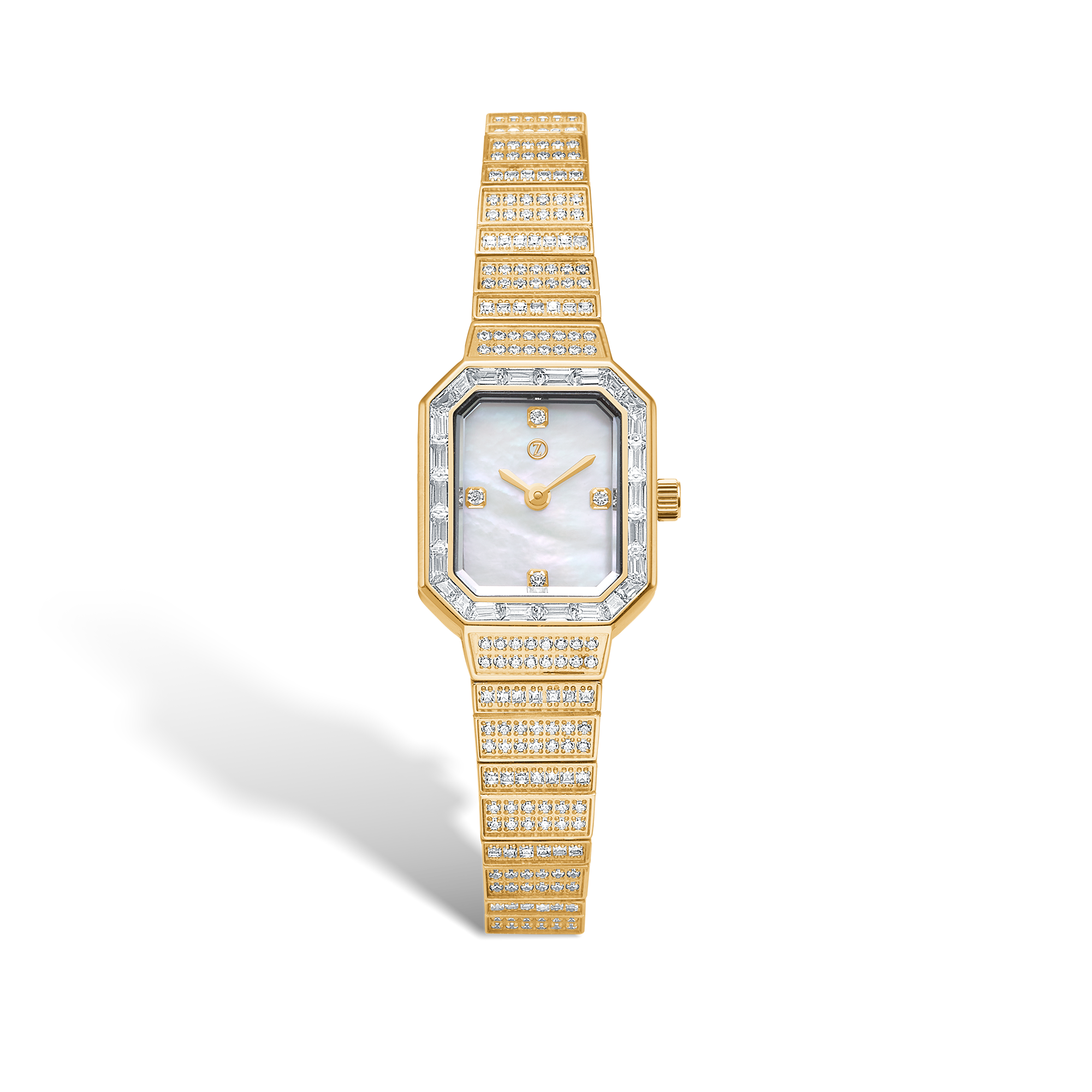 Medina og Ziegler har forenet dansk design med schweizisk præcision for at skabe et ur, hvor hver detalje er gennemtænkt. Den ottekantede urkasse i PVD-forgyldt stål indrammer en urskive af iriserende perlemor, der reflekterer lyset på magisk vis. Urets design er en stjerneregn af baguetteslebne zirkonia og Swarovski-krystaller, som elegant indfanger nattens mystik og skaber et betagende spil af lys og linjer.