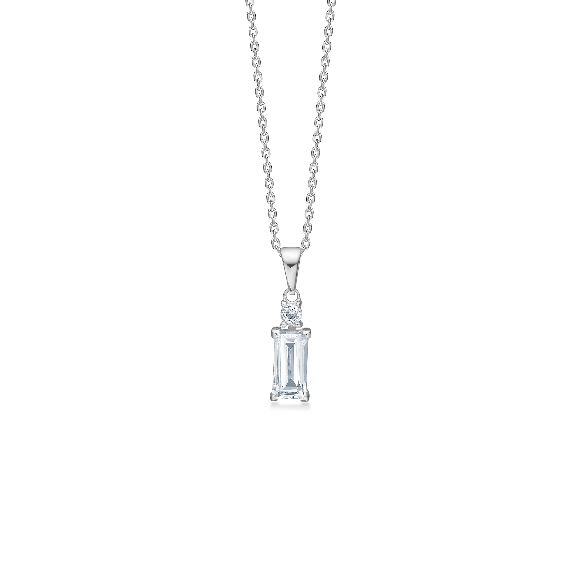 Halskæden er fremstillet af sterlingsølv med en justerbar ankerkæde for holdbarhed og tidløshed. Vedhænget er et geometrisk design, hvor en rektangulær, facetsleben topas er elegant balanceret af en rund, hvid topas. Stenene er sat i en åben grabbefatning, som lader lyset cirkulere frit omkring hver facet, hvilket forstærker deres glans.