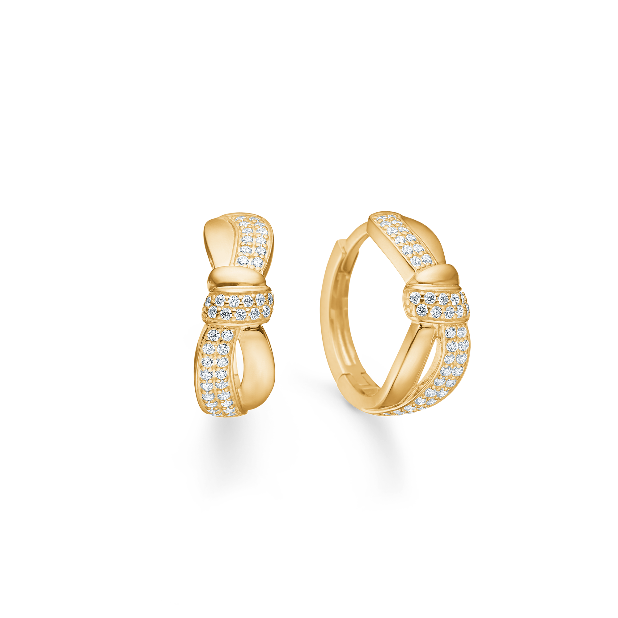 Øreringene er fremstillet af 8 karat guld med helblankpolerede overflader. De er prydet med to parallelle rækker af pavé-satte brillantslebne zirkonia, der forløber på begge sider af creolens midte og skaber et sammenhængende bånd af glimtende lys. Den skjulte hængsellås giver enkel og sikker anvendelse, og de præcise overgange afspejler White Label-kollektionens stræben efter tidssvarende luksus i ægte guld.