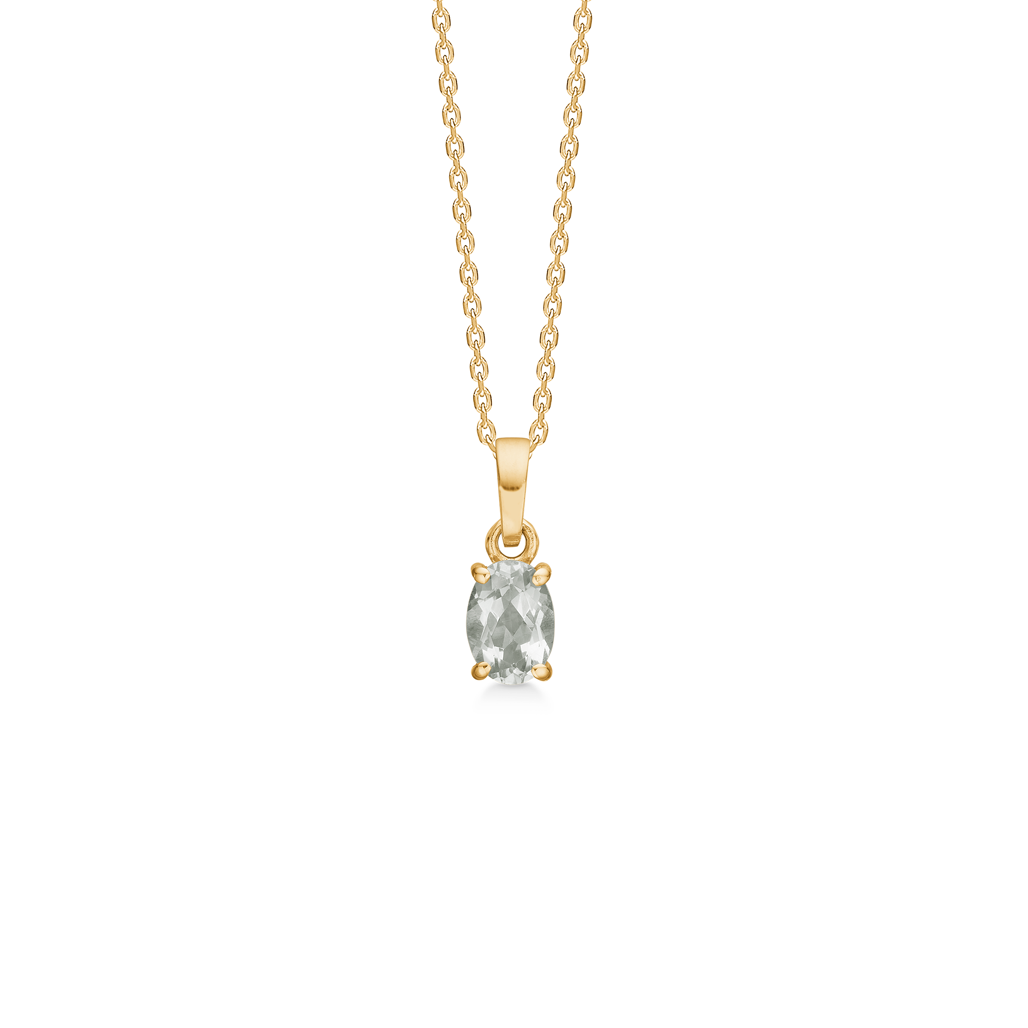 Vedhænget (måler 7 mm) er fremstillet af poleret 8 karat guld, der fungerer som et roligt omdrejningspunkt. Den grønne ametyst er sikkert indfanget af fire klassiske grabber, hvilket skaber et levende lysspil. Hver facetside spiller med lyset og understreger stenens symbolik, der knytter sig til ro og fornyelse. Vedhænget er en del af White Label-kollektionen og er et eksempel på dansk håndværk og fokus på varig værdi og enkelhed.