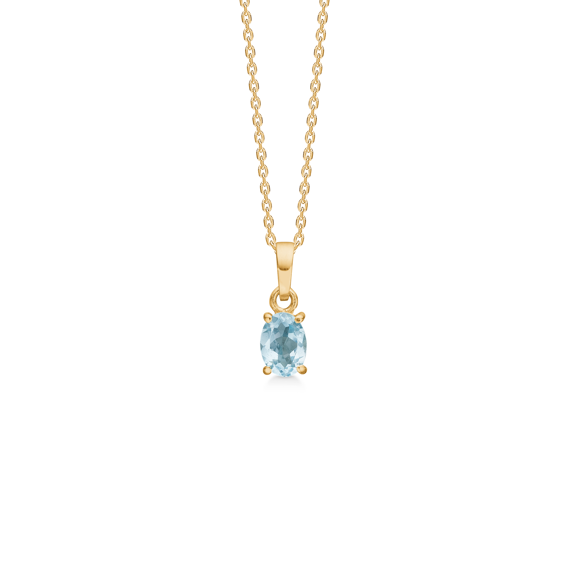 Vedhænget (måler 7 mm) er fremstillet af poleret 8 karat guld, der indrammer en facetsleben klar blå topas. Den ovale ædelsten er sat sikkert i en grabbefatning, hvilket fremmer optimalt lysindfald og et levende spil i stenen. Den kølige glans fra topasen harmonerer smukt med det varme guld, hvilket giver vedhænget et udtryk af ro og klarhed. Vedhænget er en del af White Label-kollektionen, som understreger tidssvarende dansk design i ægte materialer.