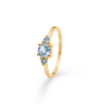 Ringen er fremstillet af 8 karat guld, hvor en stor, ovalslibet blå topas er elegant flankeret af to mindre sten. Topaserne er indfattet asymmetrisk, hvilket skaber en dynamik der spejler naturens organiske bevægelser. Denne komposition i samspil med den polerede ringskinne giver et smukt og roligt udtryk. De blå topaser symboliserer ro og balance, og understreger smykkets budskab.