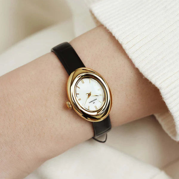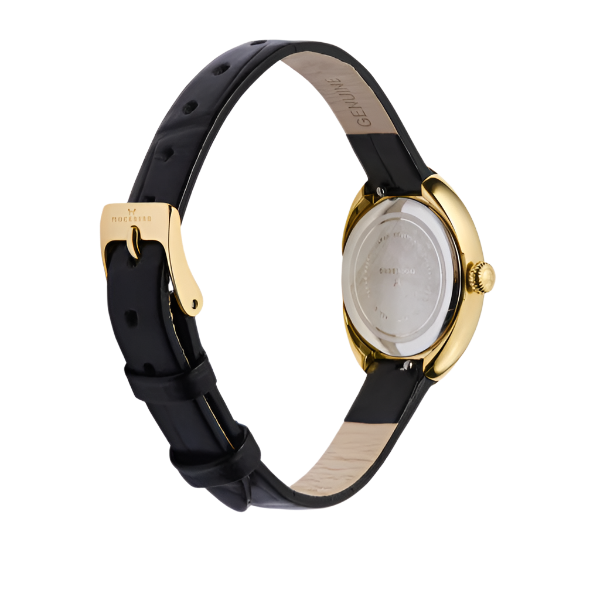 Mockberg Belle Oval Leather Gold MB1414 forener klassisk elegance og moderne finesse i ét smukt armbåndsur, hvor den blødt afrundede, ovale urkasse i guldbelagt rustfrit stål omfavner en ren, hvid urskive beskyttet af ridse- og stødresistent mineralglas. Den præcise Japan Watch Movement VJ20 sikrer, at tiden altid er korrekt, mens den sorte læderrem med diskrete gulddetaljer og en bredde på 10 mm tilfører et sofistikeret kontrastspil og former sig behageligt om håndleddet. Med en urkassediameter på 23 × 31 mm og en remlængde på 200 mm oplever du et feminint og let design, der er perfekt til både hverdagens gøremål og festlige begivenheder. Urets 3 ATM vandafvisning giver tryghed over for små stænk, og det ovale design tilfører dit look et tidløst præg, der løfter ethvert outfit med en subtil, men markant luksusfølelse.