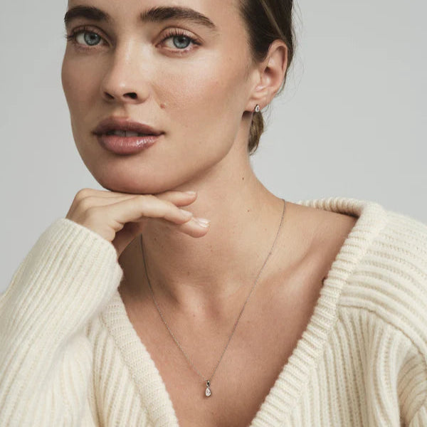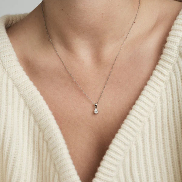 Belle White Halskæde i stål fra Mockberg er en smuk og minimalistisk kæde, der udstråler enkel elegance. Den fine dråbeformede hvide cubic zirconia-sten hænger elegant fra en tynd sølvfarvet kæde og tilfører et subtilt, men eksklusivt glimt til dit look. Halskæden er alsidig og kan bæres alene for et rent og stilfuldt udtryk eller kombineres med andre kæder for at skabe et mere personligt lag-på-lag look.