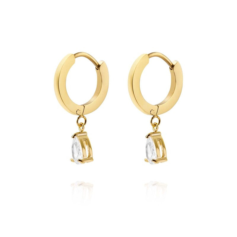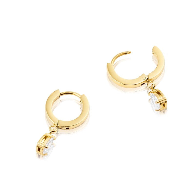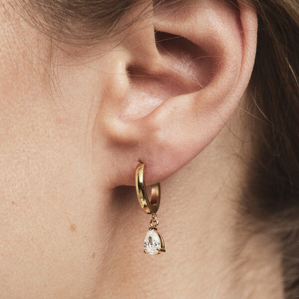 Belle White Hoops i forgyldt stål fra Mockberg er en moderne og elegant fortolkning af de klassiske hoops. De smukke, hvide dråbeformede cubic zirconia-sten er indfattet i en varm guldfarvet ramme, der giver et tidløst og feminint udtryk. Deres alsidige design gør dem perfekte til både hverdag og fest, hvor de tilføjer et subtilt, men iøjnefaldende glimt til dit look.