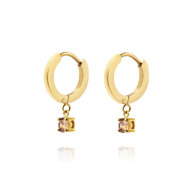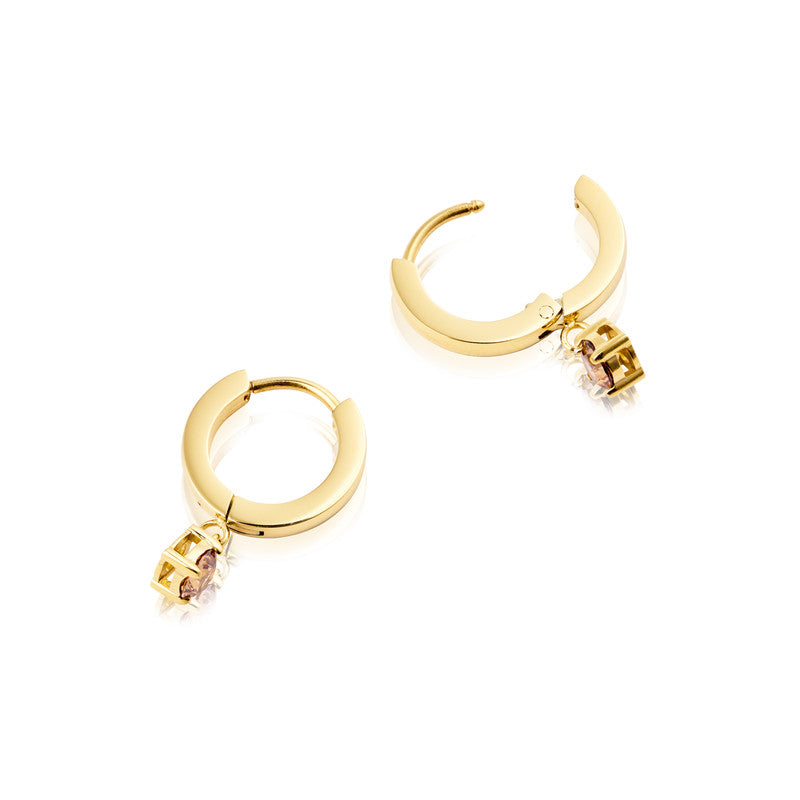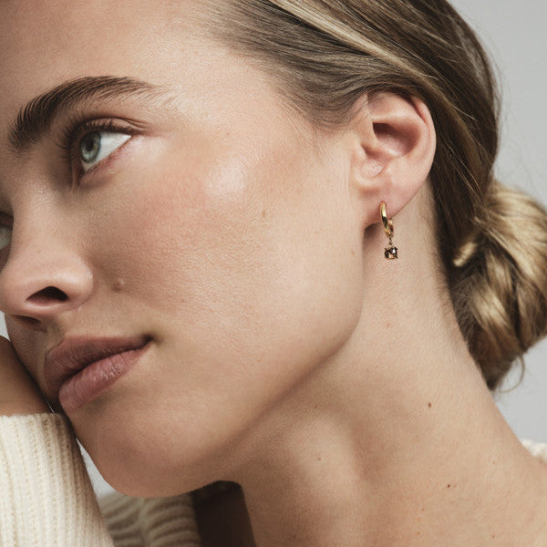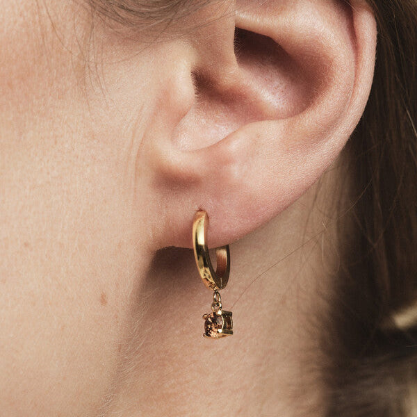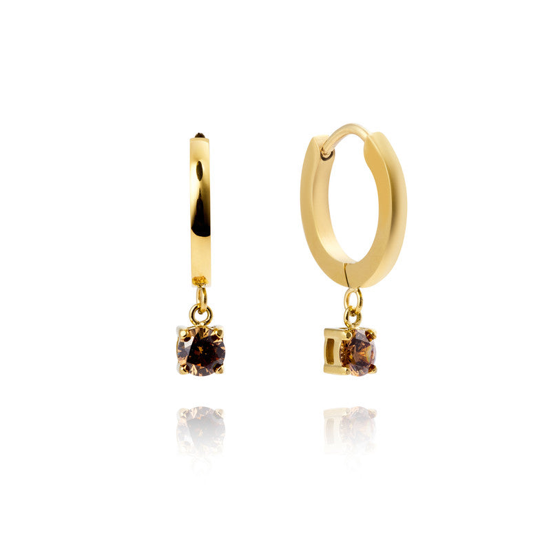 De er fremstillet i rustfrit stål med en slidstærk 18K guldfarvet PVD-belægning, som både giver en elegant glans og beskytter mod slid, så smykket bevarer sit udtryk over tid. Den tidløse form kombineret med de rige, brune nuancer gør dem til et alsidigt valg, der kan løfte både hverdags- og festlooks.