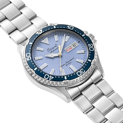 Denne eksklusive jubilæumsmodel fra Orient er skabt til at fange stemningen af uendelige sommerdage og den friske brise fra havet. Med sin himmelblå urskive i sunburst-design, solinspirerede sekundviser og det ikoniske Orient-logo i kursiv fra 1950’erne, udstråler uret både nostalgi og karakter.