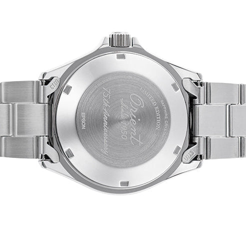 Uret måler 41,8 mm og er fremstillet i rustfrit stål med skruet bagkasse og skruekrone, som sikrer en imponerende vandtæthed på op til 20 bar (200 meter). Bagkassen er prydet med en elegant indgravering: “Orient Since 1950 – 75th Anniversary”, samt et individuelt serienummer, hvilket gør hvert ur i denne begrænsede serie på kun 6.000 styk helt unikt.