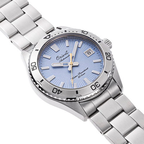 Denne eksklusive jubilæumsmodel fra Orient hylder mærkets 75-års historie med et design, der leder tankerne hen på solrige sommerdage og den friske havbrise. Uret har en iøjnefaldende himmelblå urskive med sunburst-mønster, en solinspireret sekundviser og det klassiske Orient-logo i kursiv fra 1950’erne – detaljer der tilsammen giver uret en unik vintagekarakter.
