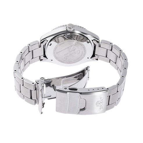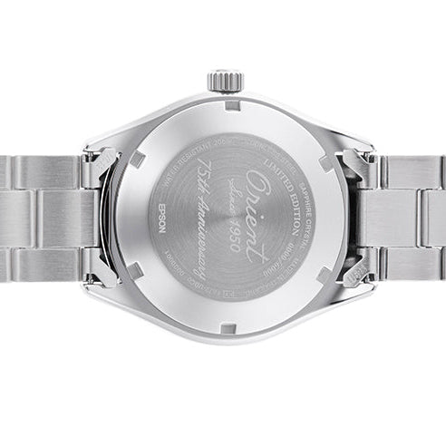 Urkassen måler 39,9 mm og er udført i rustfrit stål med skruet bagkasse og skruekrone, som sikrer en vandtæthed på op til 20 bar (200 meter). På bagkassen findes en særlig indgravering med teksten “Orient Since 1950 – 75th Anniversary” samt individuelt serienummer, hvilket understreger modellens eksklusivitet. Kun 6.000 eksemplarer er produceret på verdensplan.