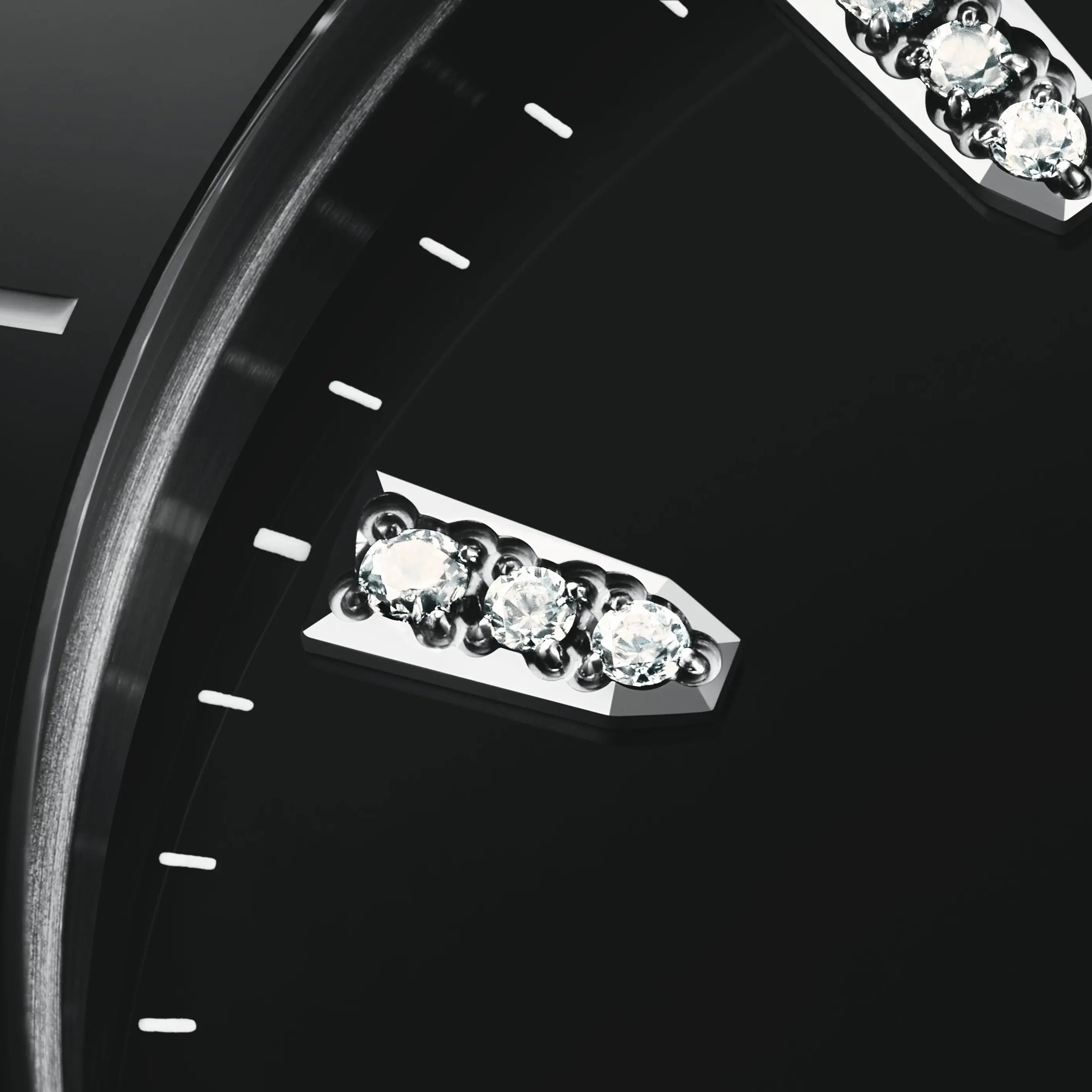 Denne model med sort urskive og stållænke forener dykkerurets robusthed med diskret luksus. Urskiven har 11 smukke timemarkører, hvoraf hver er prydet med tre brillantslebne, laboratorieskabte diamanter.