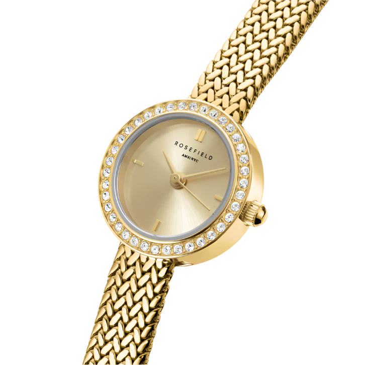Uret er udført i rustfrit stål med en luksuriøs guldbelægning i 23 karat og har en smuk skive i lyse champagnefarvede sunray-nuancer, der reflekterer lyset og tilføjer et strejf af glamour. Med 3 ATM vandtæthed egner det sig perfekt til daglig brug.